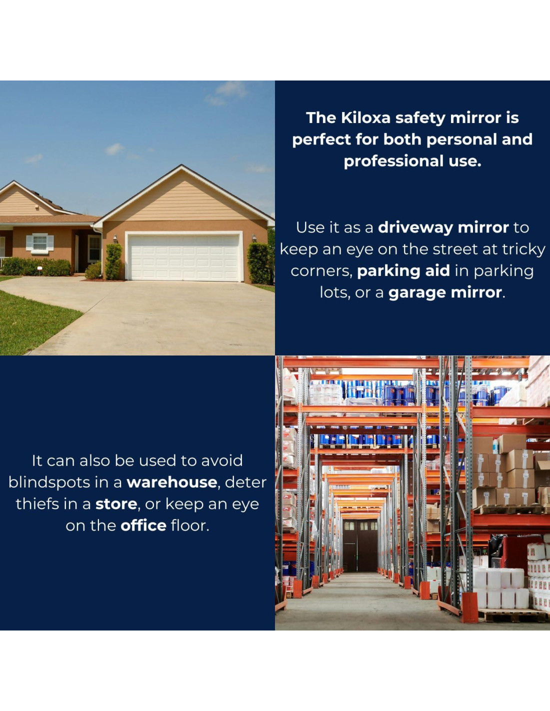 Para mayor seguridad y una excelente visión en caso de puntos ciegos peligrosos, el espejo de seguridad Kiloxa es perfecto tanto para uso personal como profesional. No importa si usas este espejo en interiores o exteriores, promueve tu seguridad. Úsalo como espejo de entrada para mantener un ojo en la calle en esquinas complicadas, ayuda para estacionar en estacionamientos, o espejo de garaje. Los puntos ciegos en tu hogar o negocio también son ayudados a ser conscientes por el espejo convexo de Kiloxa. Para disuadir robos, mantén un ojo en la caja registradora y en cualquier otra área vulnerable de tu tienda.