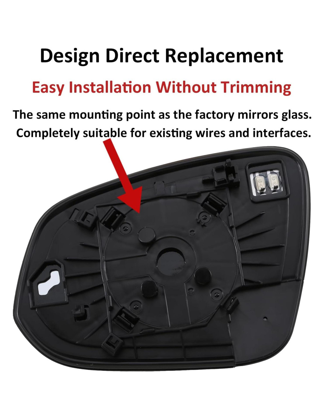 - Instalación Fácil & Puedes completar el reemplazo en unos minutos: El mismo punto de montaje que los cristales de los espejos de fábrica. Completamente adecuado para los cables e interfaces existentes. Antes de la instalación, el arnés de cables debe ser desconectado del plano de fondo existente e insertado en el nuevo plano de fondo. NOTA: Este Espejo Lateral del Pasajero No Tiene Función de Atenuación Automática. Al mismo tiempo, no hay función de detección de punto ciego, no luz de señal y no función antideslumbrante