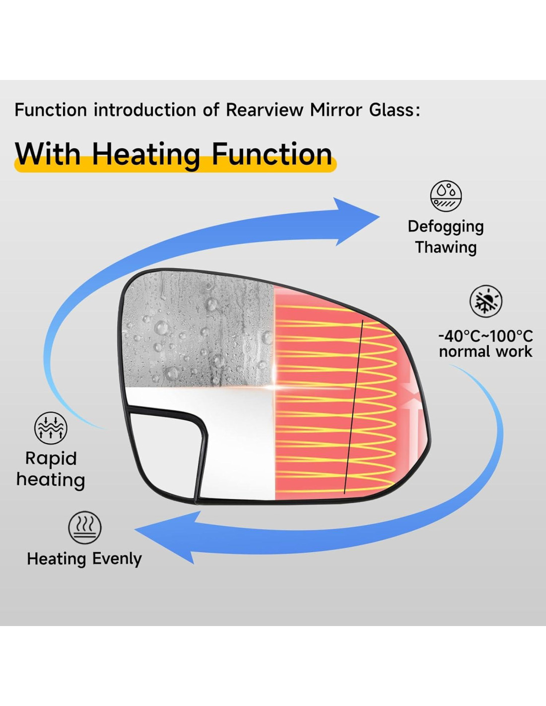 - Reemplazo de Cristal del Espejo Lateral Derecho del Pasajero con Función de Calefacción: La parte trasera de este reemplazo del espejo del pasajero está diseñada con función de calefacción, que puede eliminar la niebla y derretir el hielo y la nieve calentando desde adentro hacia afuera. Nota: Este cristal solo tiene función de calefacción, no detección de punto ciego, no lámpara de señal, no función antideslumbrante y no función de atenuación automática