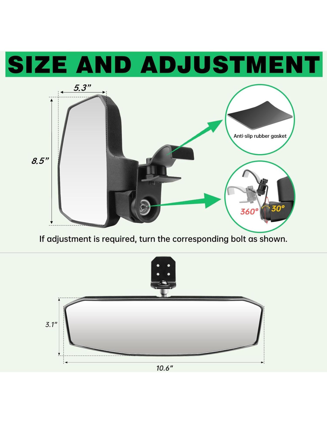 - Este kit es solo compatible con la serie Polaris Ranger. Los espejos laterales son adecuados para modelos sin puertas o con parabrisas, el soporte del parabrisas y la jaula antivuelco necesitan un espacio mayor a 3MM, mientras que el espejo retrovisor central solo es compatible con modelos que cuentan con una barra de montaje descendente.