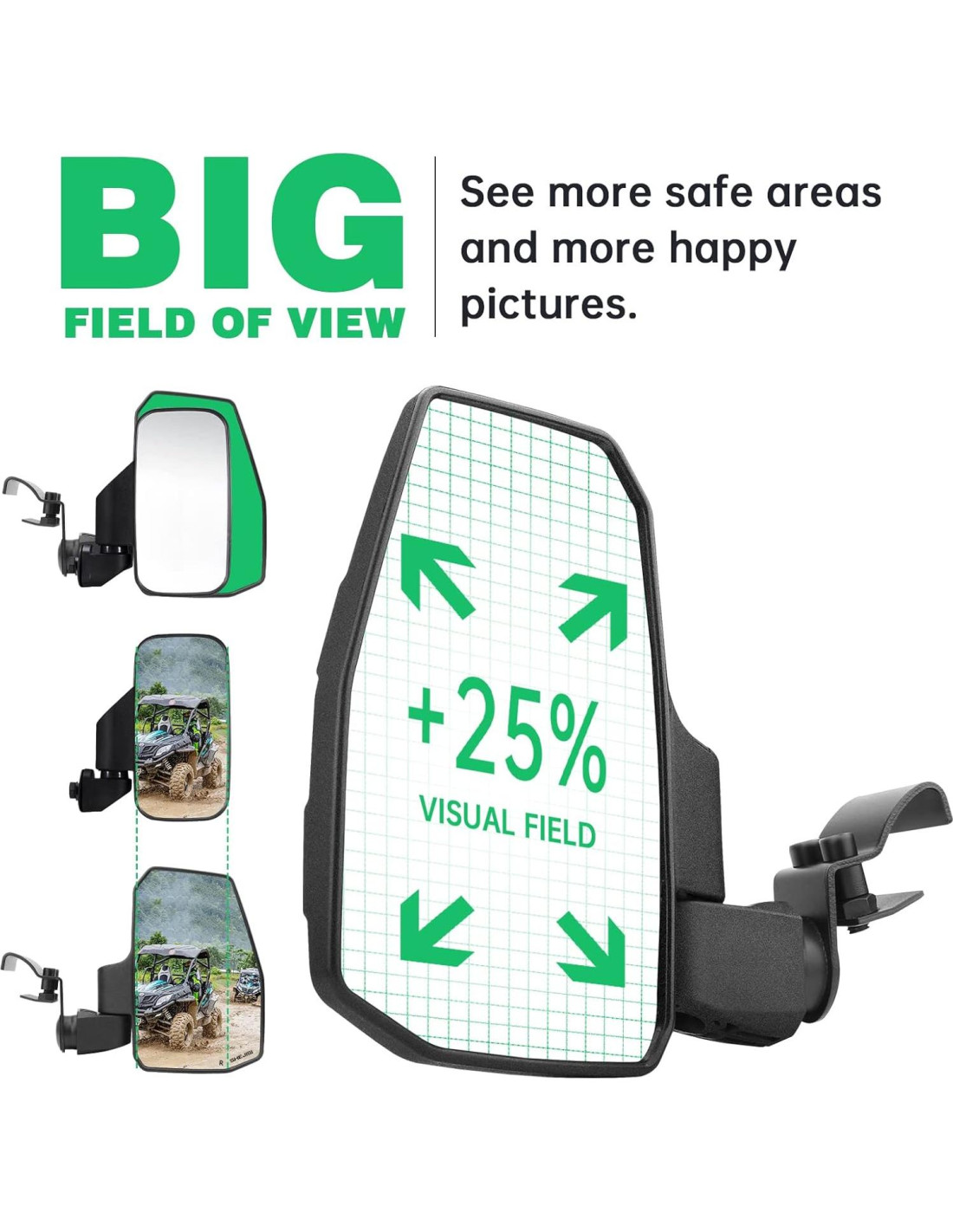 - Espejos laterales para UTV diseñados y fabricados en 2024 con una característica de retorno por resorte que se restablece fácilmente a la posición previamente establecida después de plegarse, eliminando la necesidad de pivotar manualmente, mientras mejora el ángulo de visión del lado del pasajero para una mejor experiencia de conducción y seguridad.