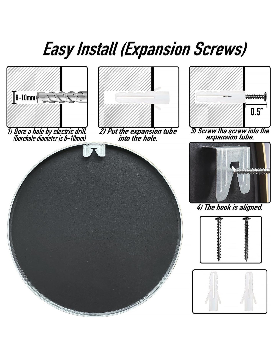 - Fácil de instalar: Las instrucciones de instalación y herramientas están en el paquete, instala los tornillos de expansión en la pared y luego cuelga el espejo en los tornillos.