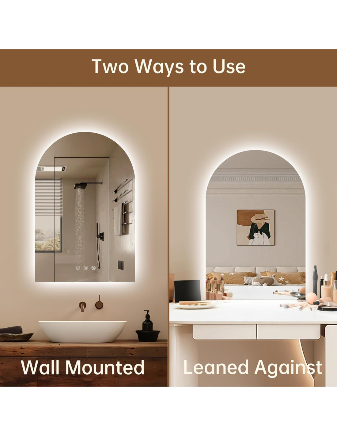 - Diseño retroiluminado arqueado elegante: El diseño del espejo de baño LED está inspirado en la fusión perfecta del diseño en forma de arco y la estética wabi-sabi. La iluminación ambiental retroiluminada arqueada hace que tu baño sea más artístico y brinda una sensación maravillosa al usuario.
