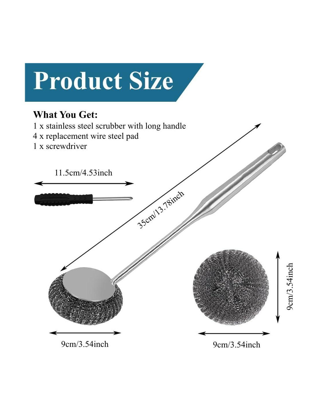 - Kit completo para máxima conveniencia - Obtén todo lo que necesitas en un paquete: 1 estropajo de acero inoxidable con mango, 4 almohadillas de repuesto y un destornillador para cambios de almohadilla fáciles. Perfecto para compartir con la familia o tener repuestos a mano para tus necesidades de limpieza.