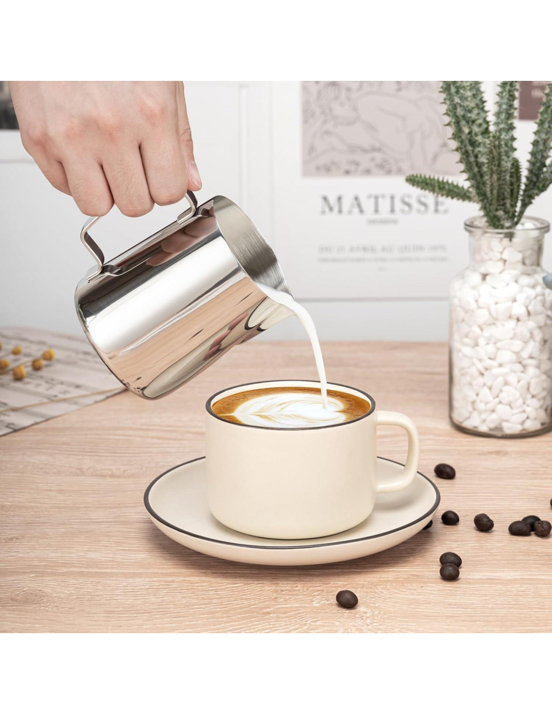 - MANGO ERGONÓMICO: Diseño de agarre bien equilibrado que asegura un vertido cómodo y preciso mientras se calienta y espuma la leche