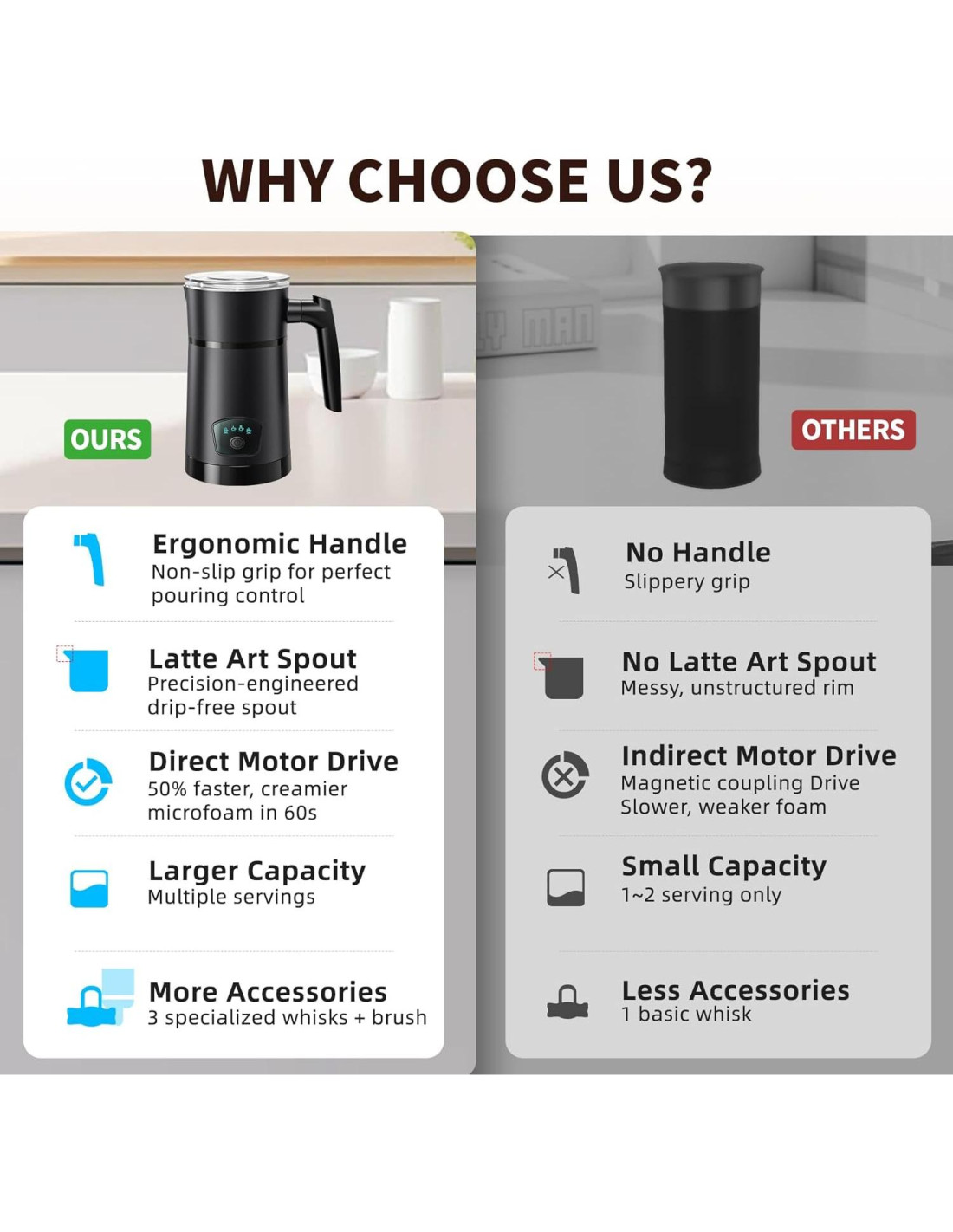 - Motor-directo - Nuestro batidor de motor directo (vs. motores de acoplamiento magnético) entrega burbujas 30% más finas. En modo de espuma fría, logra microespuma de calidad de barista en 1 minuto, 50% más rápido, reduciendo el tiempo a la mitad mientras crea espuma más sedosa y densa para una textura profesional.