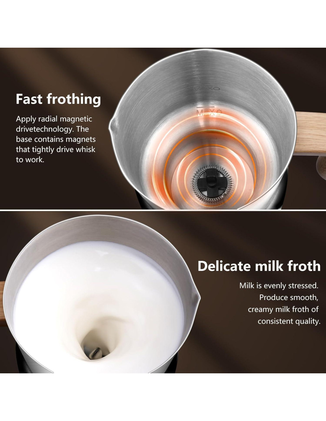 - [Calentamiento por inducción seguro] En lugar de calentamiento tradicional por fondo, nuestro espumador de leche automático aplica calentamiento por inducción seguro (IH) para calentar los ingredientes de manera envolvente, lo que es más eficiente, uniforme, silencioso y puede evitar el sobrecalentamiento y la leche quemada. Si el espumador de leche automático no se opera dentro de los 60 segundos, entrará en estado de espera. Seguro y eficiente en energía, cumple con tus requisitos de seguridad y calidad para el arte del café.