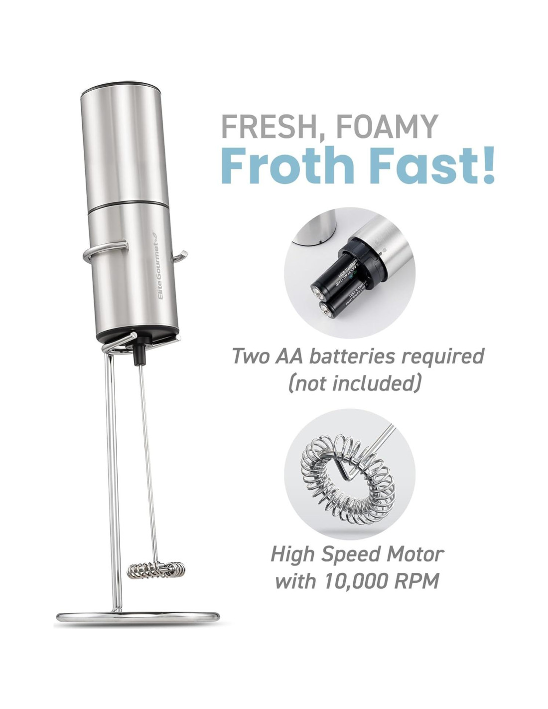El Espumador de Leche Inalámbrico Elite Gourmet, Operado por Batería (2 pilas AA no incluidas) hace espuma perfecta y espumosa para lattes, capuchinos y mezcla otros líquidos o polvos para bebidas de calidad de café en casa. Está construido con un elegante cuerpo ligero de acero inoxidable cepillado y un batidor de acero inoxidable 304 de 27 lazos diseñado para facilitarte disfrutar de tus bebidas favoritas en casa por una fracción del costo de las cafeterías. El potente motor produce más de 10,000 RPM para que el batidor de acero inoxidable pueda espumar o mezclar todo tipo de leche, incluyendo soja, avena, entera, mitad y mitad, baja en grasa, almendra y más. El espumador requiere 2 pilas AA que son fáciles de quitar y reemplazar. Se incluye un soporte vertical para tu conveniencia y fácil almacenamiento. Tiene un botón de encendido/apagado sensible a la presión de un toque, por lo que funciona rápida y efectivamente, espumando o mezclando tus leches o polvos favoritos en una espuma espumosa o a una consistencia suave. Con su diseño delgado y ergonómico, el espumador es cómodo para todos los agarres, ya sea con la mano izquierda o derecha. Es compacto, potente y portátil para usar en cualquier momento y lugar. El batidor está diseñado para una operación sin desorden y es fácil de limpiar y almacenar. Simplemente enjuaga o sumerge en agua tibia, seca y guarda para el próximo uso. NOTA: PARA PREVENIR EL SOBRECALENTAMIENTO NO OPERE EL ESPUMADOR POR MÁS DE 3 MINUTOS DE MANERA CONTINUA.