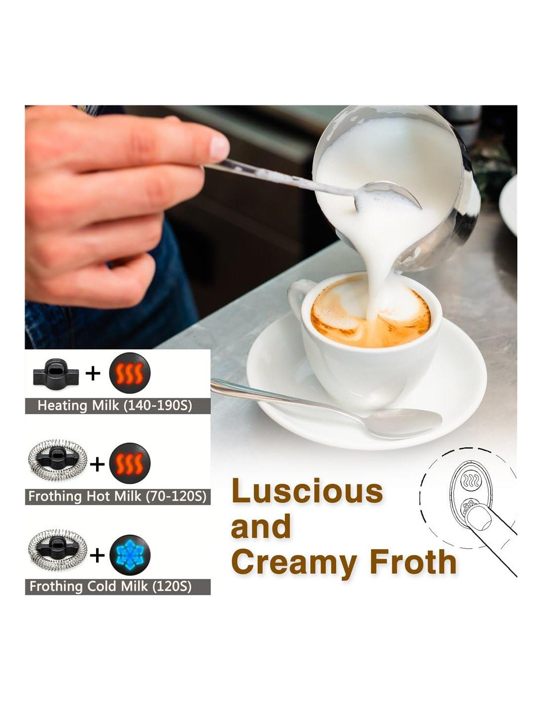 - [OBTÉN LA ESPUMA DE LECHE MÁS SUAVE Y CREMOSA EN SEGUNDOS] : Diseñado para todos los amantes de la leche espumosa y el café. El espumador de leche automático calienta la leche a aproximadamente 140 Fahrenheit (60C) y te ofrece espuma de nivel barista en 60-120 segundos, espuma rica, suave y cremosa para tu bebida de café favorita, Latte, Capuchino, Chocolate Caliente, etc. Se recomienda usar leche entera (Contenido de grasa>3%) para mejores resultados. Disfruta de calidad de café en casa ahora mismo.