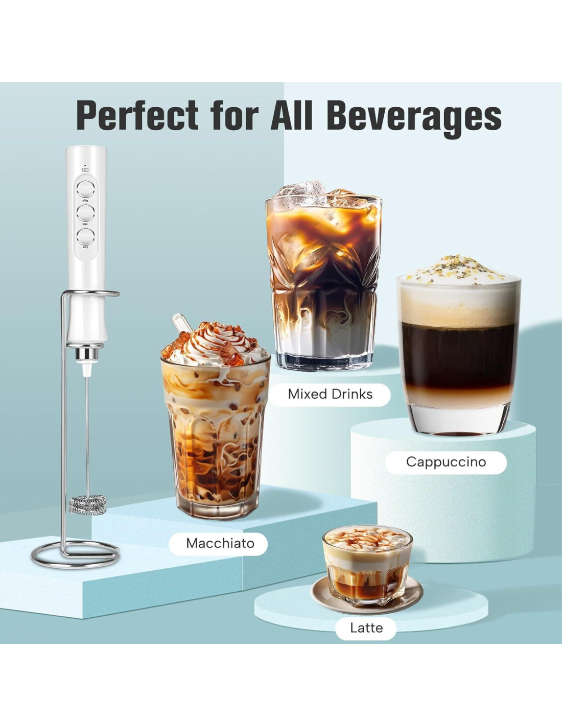- [Espumador de Leche de Mano de Alta Calidad] Solo usamos materiales premium. La cabeza del espumador de leche está hecha de acero inoxidable. Y este batidor de bebidas no es desmontable y es más duradero que otros batidores desmontables. La herramienta de batido eléctrica le da ese toque de acabado de alto nivel a tu capuchino, Macha. Y puede ser un pequeño batidor de mano que mezcla una variedad de bebidas calientes y frías, incluyendo batidos de proteínas, lattes de matcha y bebidas en polvo.