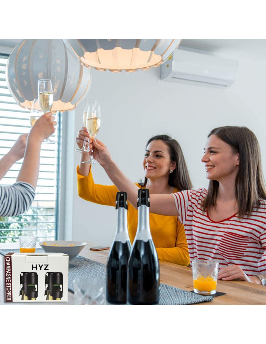 - RESELLAR CHAMPAGNE ABIERTO: El conservador de champagne HYZ sella y aumenta la presión en la botella, asegurando que las burbujas de su bebida se mantengan intactas. Almacene su botella ya sea en posición horizontal o vertical, el sello funciona igualmente bien en ambas posiciones. 2 Tapones de Champagne Negros