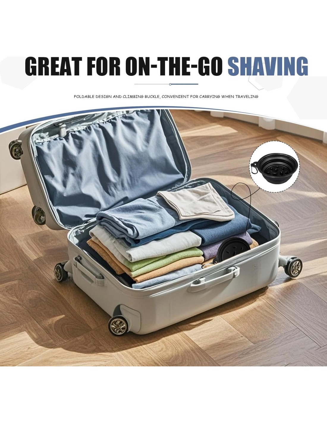 - Diseño Portátil y Plegable: Este tazón de afeitar de silicona se pliega a solo 1.5 centímetros de grosor y viene con un mosquetón para facilitar el viaje. Perfecto para hombres en movimiento, ideal para acampar, gimnasio o viajes de negocios