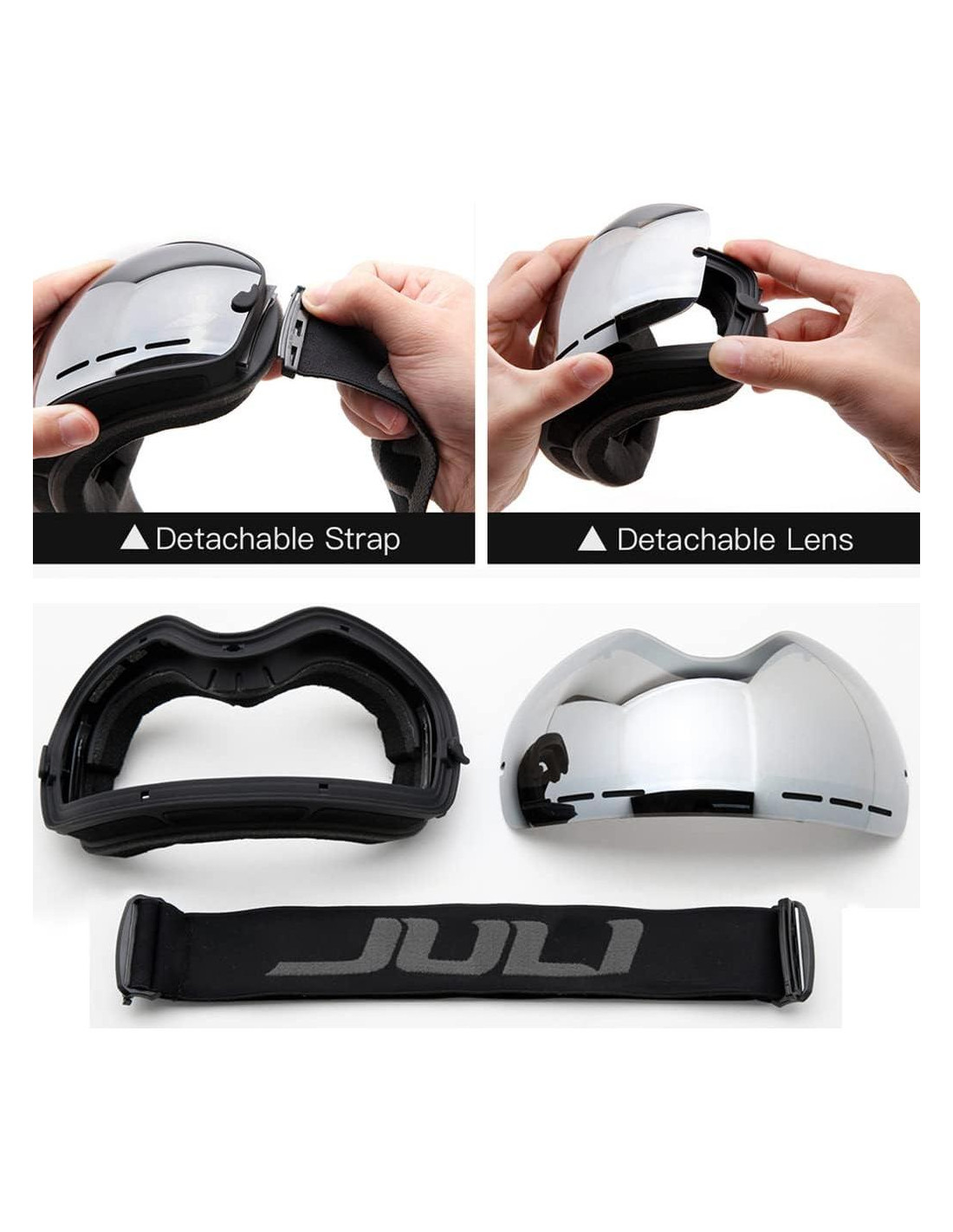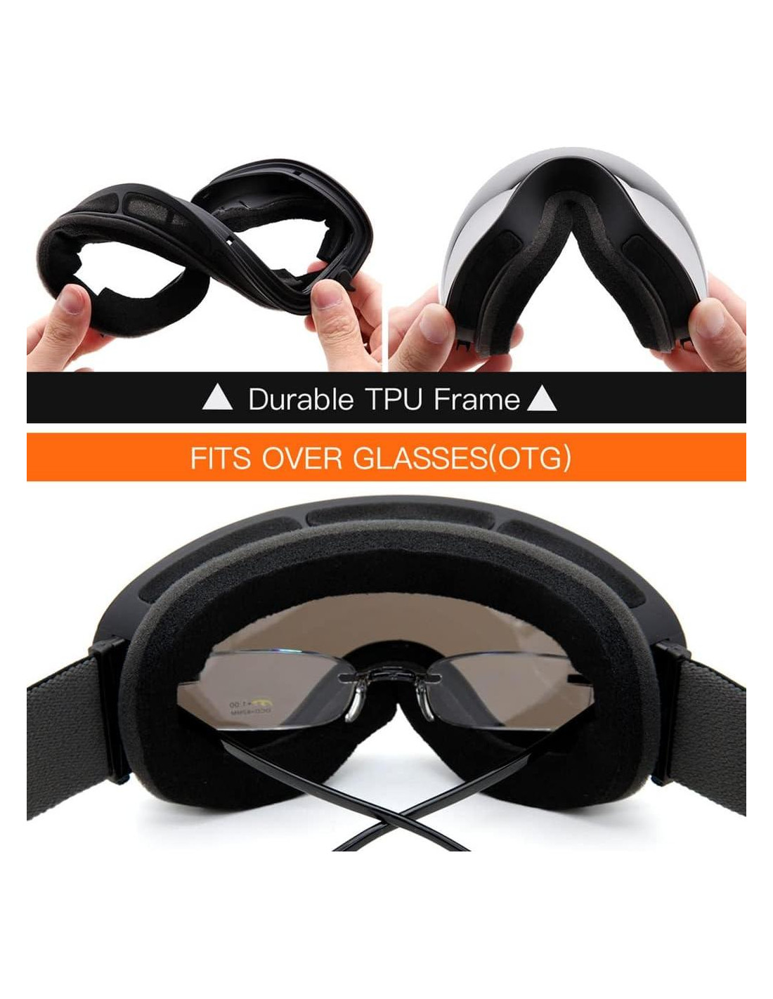 El sistema de lentes desmontables ofrece lentes de repuesto con diferentes colores, VLTs adecuados para diferentes condiciones climáticas y preferencias personales al esquiar, hacer snowboard u otros deportes de invierno. Diseñado para reducir el empañamiento y optimiza el flujo de aire sobre el interior de la lente. Las gafas de esquí proporcionan un sistema de flujo de aire suave que trae aire fresco y expulsa la humedad rápida y efectivamente. La gran lente esférica sin marco proporciona una vista verdaderamente despejada y sin obstrucciones de las pendientes. ¡Gran espacio interior! Diseñadas para usarse sobre la mayoría de las gafas recetadas. ¡Visibilidad primero! VLT 0-10% - Para días soleados VLT 10-25% - Para días parcialmente nublados a soleados VLT 25-60% - Para días nublados y al anochecer VLT 60-90% - Para noches y días muy nublados 1. Por favor, no restriegue la lente con demasiada frecuencia ya que puede reducir el rendimiento de la película antiempañante, especialmente en el cristal interior, use un paño de limpieza suave para limpiar suavemente el polvo. 2. Por favor, no use rímel u otra sustancia aceitosa para evitar que la lente se ensucie. 3. Las gafas tienen buena resistencia, pero por favor no las doble demasiado tiempo ya que puede crear rayones en el marco. 4. Por favor, guarde las gafas en un lugar seco y bien ventilado. 5. Las lentes de repuesto se venden por separado. Material del marco: TPU Tipo de lente: Esférica Acabado de la lente: REVO completo Tamaño de la lente: 17.5 centímetros (W) x 9.7 centímetros (H) Ventilación: Canal de dos vías Recomendado: Esquí / Snowboard Material de la lente exterior: PC Material de la lente interior: CP Lente desmontable: Sí Correa desmontable: Sí Compatible con OTG: Sí Compatible con casco: Sí Protección UV400 y antiempañante: Sí