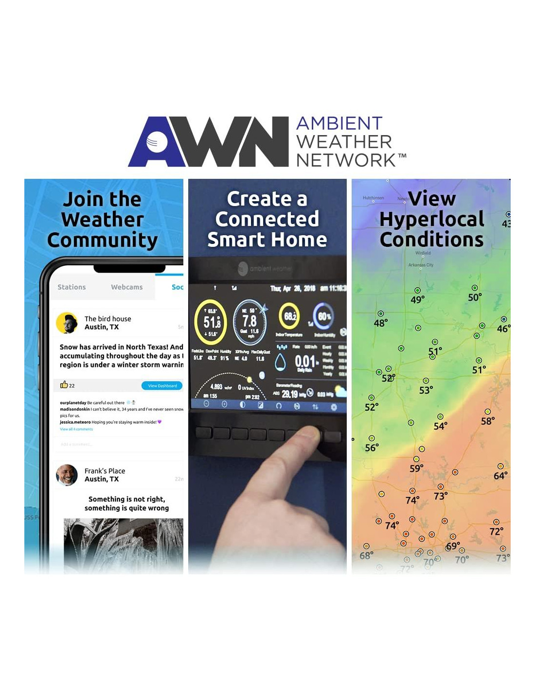La Ambient Weather WS-8482 monitorea las condiciones interiores y exteriores, incluyendo temperatura y humedad interiores y exteriores, índice de calor y punto de rocío. La consola mide localmente y hasta 7 sensores pueden conectarse para monitoreo remoto. Los canales 1-7 para los sensores remotos se muestran con una función de desplazamiento automático. La consola admite tanto unidades de medida imperiales como métricas y muestra datos mínimos/máximos, permitiéndote configurar alertas independientes para todos los parámetros. La hora y la fecha se sincronizan automáticamente con el servidor de tiempo NIST de Internet. Incluye calibración opcional de temperatura y humedad para mantener la máxima precisión. Presenta una página web fácil de usar para configurar los ajustes WiFi de la consola y conectarse a tu enrutador WiFi. ¡No hay aplicaciones para descargar! El termohigrómetro inalámbrico exterior TX-3110B transmite datos a tu consola WS-8482. Admitirá tanto unidades de medida imperiales como métricas. La consola de la estación meteorológica incluye dos niveles de conectividad inalámbrica. Los sensores se conectan a la consola a través de RF (915 MHz), y la consola se conecta a tu enrutador (2.4 GHz). La transmisión WiFi RF en aire libre hasta 24.38 metros. Una señal inalámbrica no pasará a través de metal sólido, tierra o suelo. Coloca la consola al menos a un metro de distancia de computadoras, televisores y teléfonos inalámbricos. El termómetro flotante para piscina y spa TX-3107 es ideal para propietarios que desean monitorear y enviar notificaciones de alerta cuando la piscina o spa está demasiado caliente o fría. El sensor impermeable muestra la temperatura del agua y la transmite de forma inalámbrica a la consola de visualización. El sensor flotante para piscina y spa está diseñado para flotar. No debe sumergirse ni mantenerse bajo una cubierta. Usa un anclaje (cuerda) para fijar el sensor en la piscina o spa. Para mejores resultados, colócalo a menos de 30.48 metros de la consola. La WS-8482 admite hasta 7 sensores. Mezcla y combina de nuestra serie de sensores termohigrómetros TX-31, sensores de humedad-temperatura del suelo y termómetros de piscina/spa. Con nuestras estaciones meteorológicas, sensores y servicio en la nube, Ambient Weather ha desarrollado un conjunto de herramientas que transmiten sin problemas las condiciones meteorológicas en tiempo real a Internet, permitiendo una comunidad de profesionales y entusiastas del clima que, juntos, crean una rica red de datos meteorológicos que abarca el globo. Visualiza rápidamente información detallada con nuestros módulos expandibles animados. Presenta diales, medidores, gráficos e informes de texto para cada parámetro. Monitorea condiciones interiores y exteriores, incluyendo velocidad del viento, dirección del viento, lluvia, UV, radiación solar, temperatura interior, humedad interior, presión barométrica, punto de rocío, índice de calor, sensación térmica y más. Nuestro diseño amigable para móviles y responsivo te permite personalizar tu panel de control, analizar gráficos, generar informes y enviar alertas por correo electrónico o mensaje de texto para proteger tus pertenencias en y alrededor de tu hogar o negocio. AmbientWeather.net funciona con IFTTT, Amazon Alexa, SmartThings, Home Assistant, Weather Underground y PWSWeather, por nombrar algunos. La aplicación Ambient Weather Network también está disponible en Google Play y la App Store de Apple. Accesible fácilmente para cualquiera con conexión a Internet, esta comunidad ofrece información meteorológica robusta y significativa, directamente desde el patio trasero de un vecino, amigo o colega de confianza. Nuestra plataforma de mapeo combina nuestra amplia red de estaciones meteorológicas con radar en vivo, superposiciones de temperatura y viento, y pronósticos precisos para cualquier ubicación en la tierra. Visualiza tus datos con gráficos diarios, mensuales y anuales, o personaliza tu intervalo de gráficos. Los mosaicos expandibles y los gráficos y tablas útiles te permiten analizar tus datos. Para un análisis más profundo de los datos, descarga archivos csv. Si solo necesitas una actualización rápida, configura alertas por correo electrónico o mensaje de texto para condiciones altas y bajas para cada parámetro. Puedes enviar múltiples alertas para el mismo parámetro y ver todas las alertas pasadas en una línea de tiempo útil.