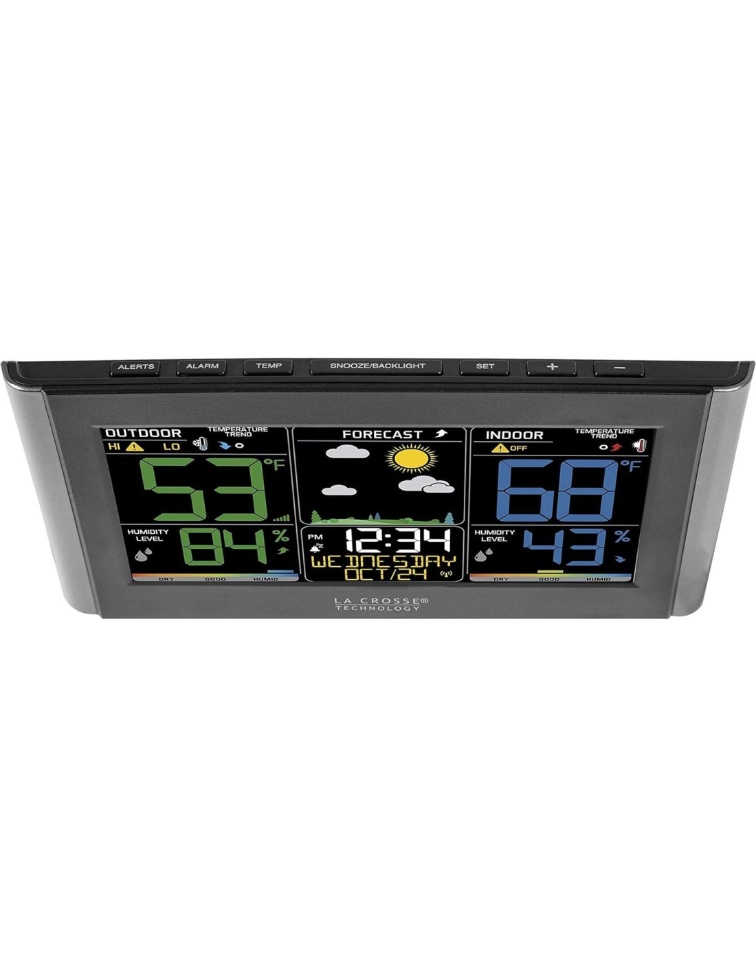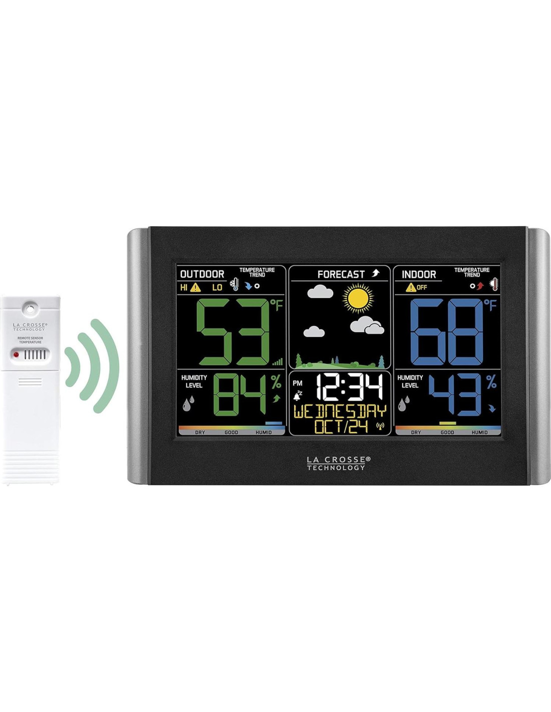 La Crosse Technology presenta la Estación Meteorológica Inalámbrica a Color con clima trasero preciso y en tiempo real. La pantalla a color completa te ofrece pronósticos dinámicos del clima ajustados a la presión barométrica. El indicador de confort interior puede ayudar a lograr un ambiente de vida cómodo y saludable y puede incluso ahorrarte costos de calefacción. Monitorea la temperatura y la humedad actuales de tu patio trasero de un vistazo con el sensor exterior transmisor incluido y los registros históricos de las temperaturas máximas y mínimas diarias. Mantente a tiempo con su hora y fecha autoajustables precisas y reinicios automáticos para el horario de verano. Incluye adaptador de corriente para controles de intensidad total y pantalla de retroiluminación constante o funciona con baterías (se venden por separado) para la función de retroiluminación bajo demanda para ahorrar batería. ¡Mantente al día con tu propio meteorólogo personal en casa! ¡Tu clima, hoy!
