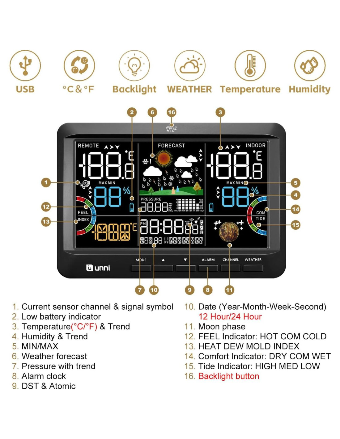 3 niveles de temperatura exterior para tus planes de actividad. Ver condiciones interiores y exteriores representación visual de la temperatura actual con pronósticos futuros. Depende de la humedad interior e indica el grado de confort que sentirías. ALTO MEDIO BAJO 3 niveles de marea se actualizarán automáticamente con la fecha. No proporciona horarios de marea diarios. 0512 Estación Meteorológica Reemplazo B0DM7SQC4M 0581 0582 0585CS UN03 0601 1. Primero carga la batería del sensor, luego instala la batería/unidad de alimentación principal. Nota: Cuando la fuente de alimentación está conectada a la unidad principal, pero no funciona, asegúrate de que la fuente de alimentación esté conectada firmemente. 2. Espera 10 minutos: Durante 3 minutos después de la conexión, el sensor obtendrá datos de temperatura y humedad. Durante los siguientes 7 minutos, la unidad principal comenzará a recibir la señal atómica. Durante estos 10 minutos, los datos de temperatura y humedad no se actualizarán. La señal atómica tarda de 2 a 5 días en sincronizarse. Si excede los 5 días, puedes ajustar la hora y la fecha manualmente. El indicador de marea se actualiza por la fecha, no proporciona horarios de marea diarios. 1. Asegúrate de que la fuente de alimentación esté conectada firmemente. 2. Solo cuando el adaptador esté conectado, la luz de fondo puede mantenerse encendida/ajustarse. La batería solo se ilumina durante 10s, principalmente para respaldar datos. 1. Espera 2 horas para equilibrarte con el entorno actual. 2. Comparando con otros termómetros: colocados en la misma posición, espera 1 hora.