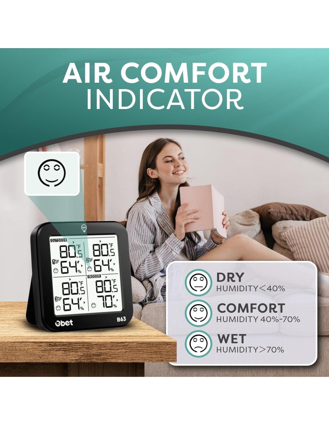 - Indicador de Confort del Aire: El termómetro inalámbrico interior exterior con función de indicador de confort del aire puede actuar como una advertencia de salud. Depende de la humedad e indica el grado de confort que una persona sentiría.