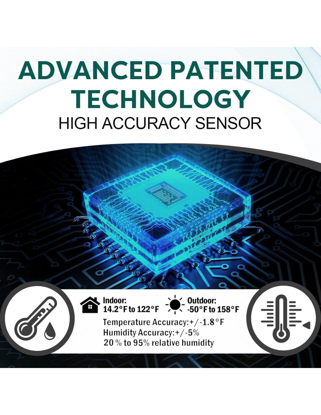 - Tecnología Patente Avanzada: El sensor de temperatura y humedad adopta tecnología patente avanzada para asegurar que sea muy sensible a los cambios en la temperatura y la humedad en el entorno, brindándote lecturas precisas. La precisión de temperatura es +/1.0 C y la precisión de humedad es +/5%.
