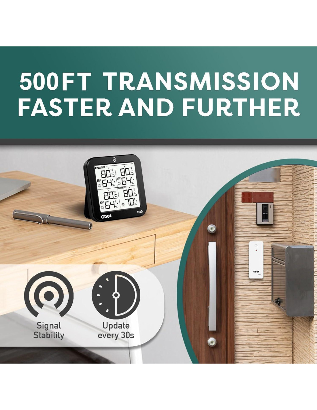 - Soporte para 3 Áreas: El termómetro interior exterior está emparejado con 3 sensores de temperatura remotos que transmiten una señal constante hasta 500 pies (150 m) de distancia. En el medidor de temperatura, puedes monitorear simultáneamente la temperatura y la humedad de tu sala de estar, dormitorio, garaje y jardín. Este termómetro digital de 3.9 pulgadas para el hogar te ayuda a vivir una buena vida.