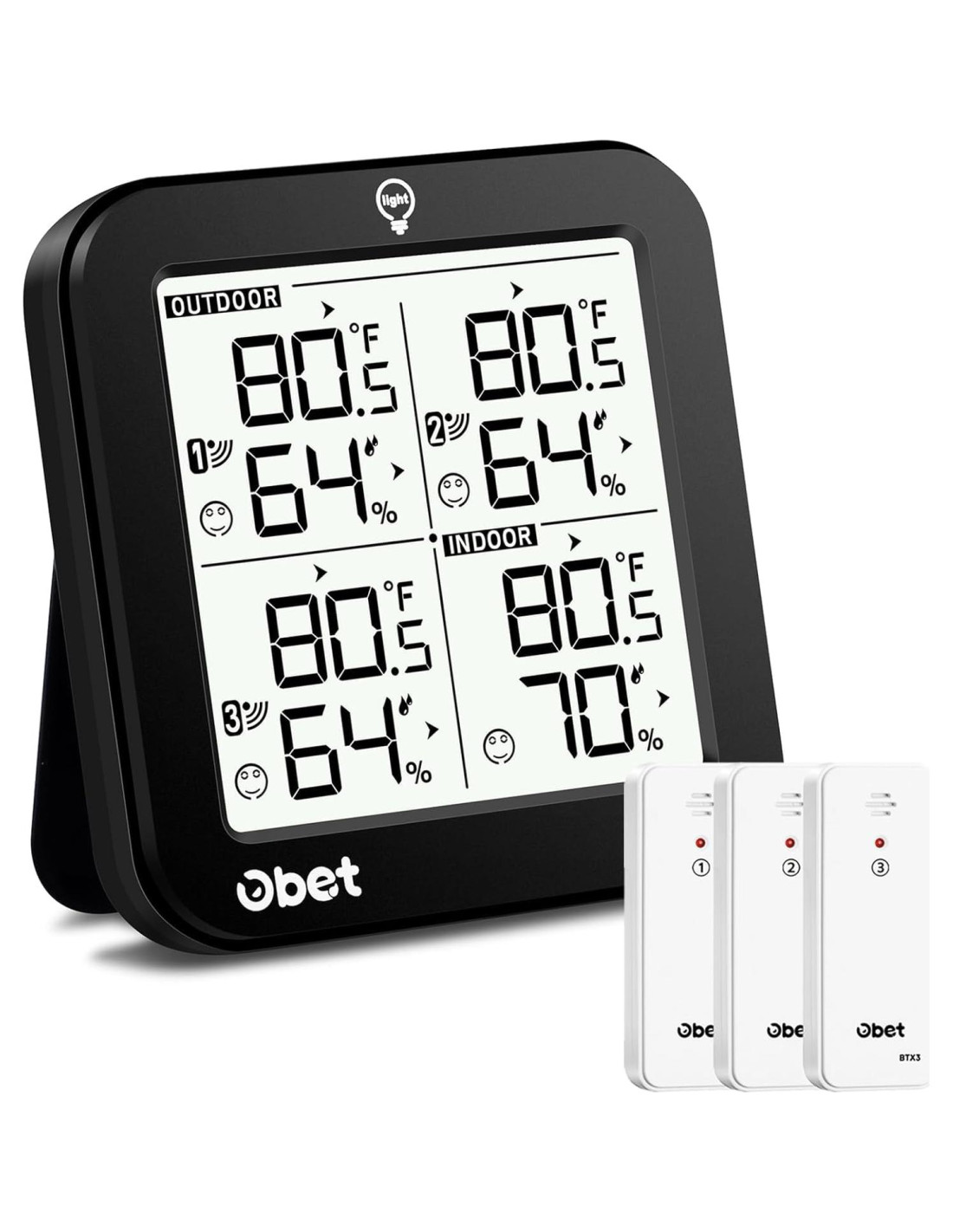 - Lo Que Obtienes: El paquete contiene 1 termómetro inalámbrico, 3 sensores de temperatura inalámbricos, 1 cable USB y un manual de instrucciones (batería no incluida). Para que los clientes tengan una mejor experiencia, OBET no solo proporciona 30 días de devolución e intercambio en Amazon, sino que también ofrece un servicio de garantía adicional de un año.