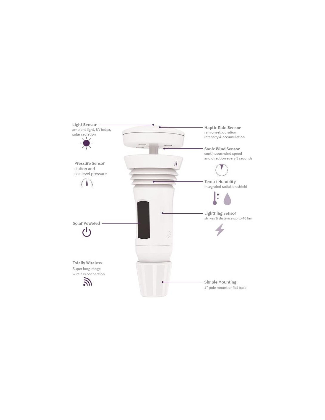 - Monitorea temperatura, humedad, presión barométrica, velocidad y dirección del viento, punto de rocío, radiación solar, índice UV, rayos, precipitación y más, todo desde un solo dispositivo.