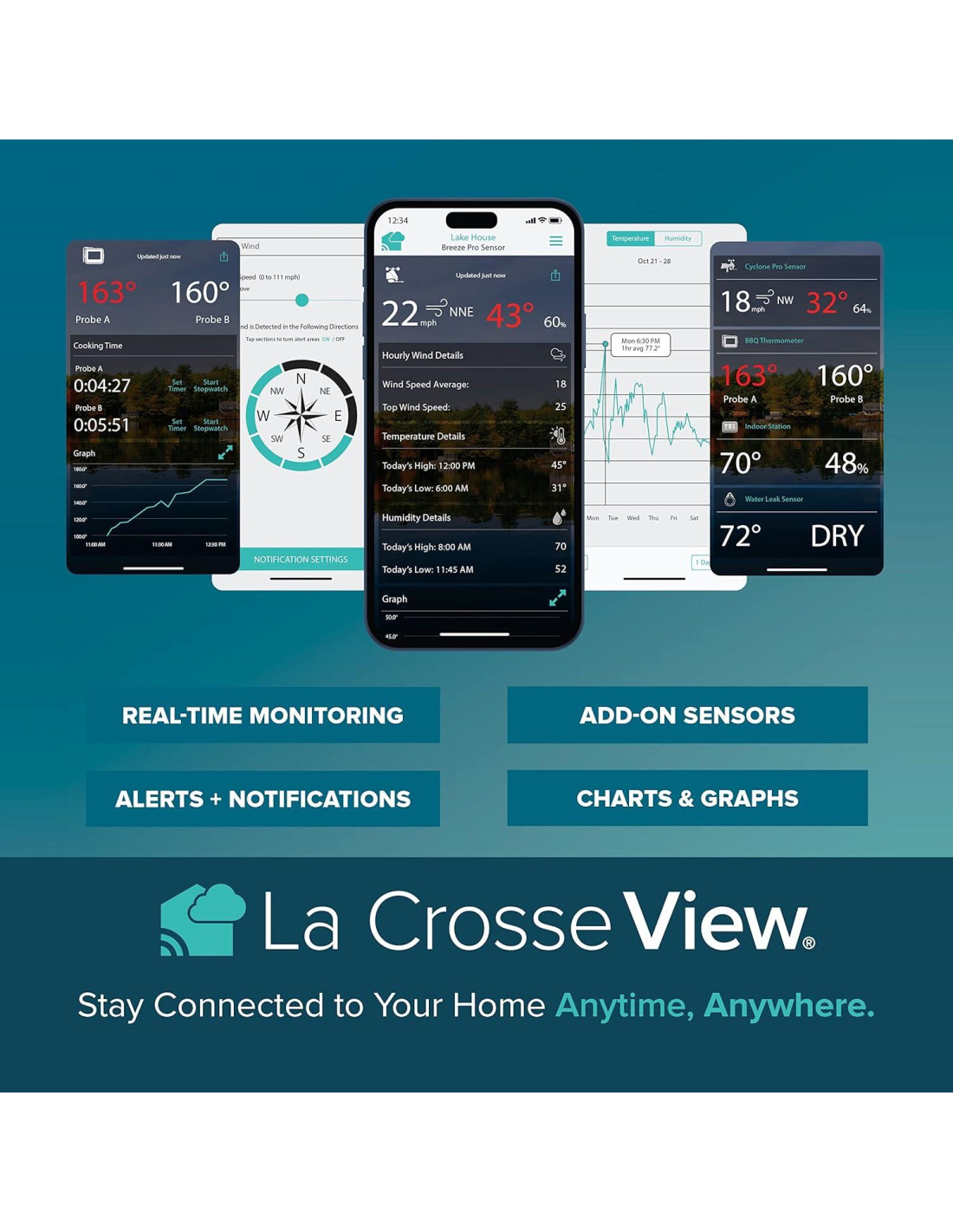 - Datos MEJORADOS cuando está conectado a Wi-Fi, incluyendo: opciones de transmisión de datos de AccuWeather, índice UV, horas de salida/puesta del sol, tormentas eléctricas, calidad del aire y más; Rastrea y Monitorea el Clima de tu Jardín en la aplicación móvil gratuita La Crosse View con Alertas y Notificaciones personalizables