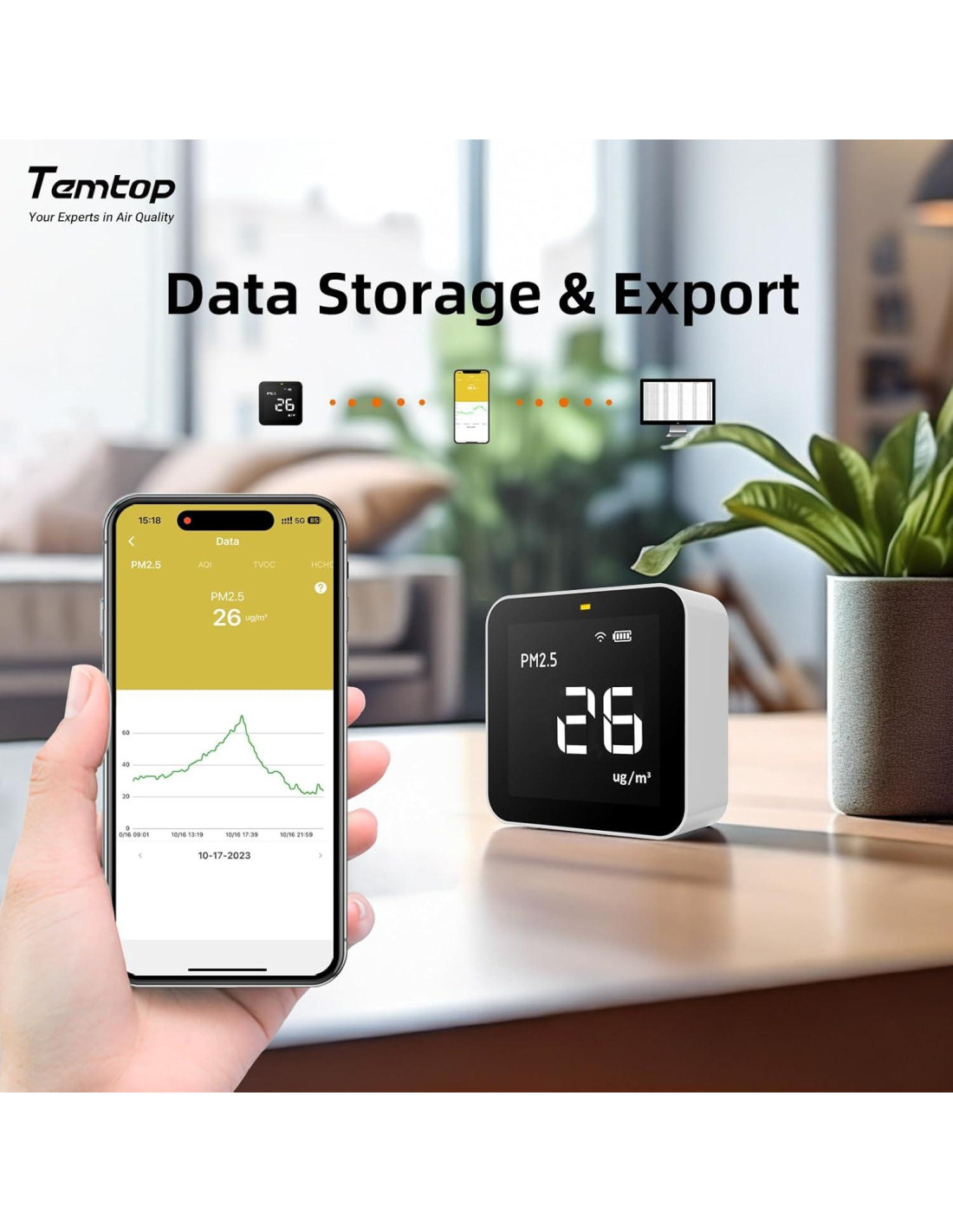 - [Medidor Multifuncional 4-en-1] Este dispositivo compacto ofrece una variedad de funciones. Además de detectar PM2.5, también puede medir formaldehído y TVOC, proporcionando una evaluación integral de la calidad del aire interior. Al comprender los niveles de limpieza o contaminación, puede tomar medidas oportunas para proteger su salud.