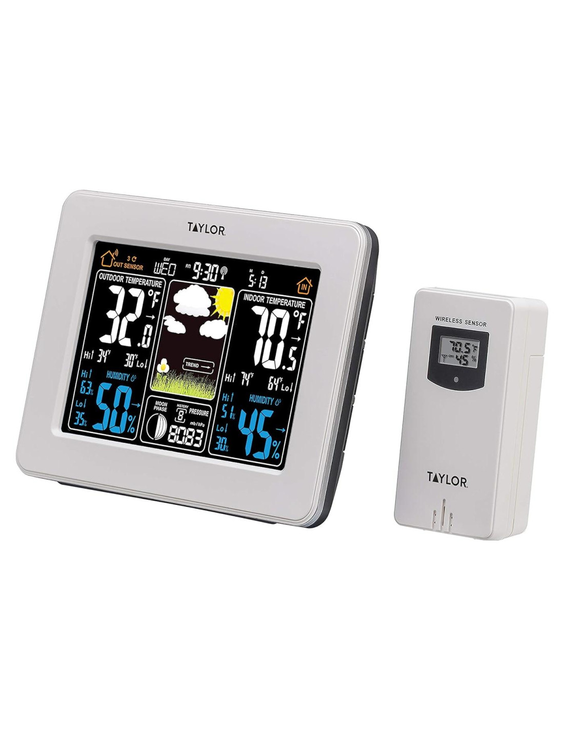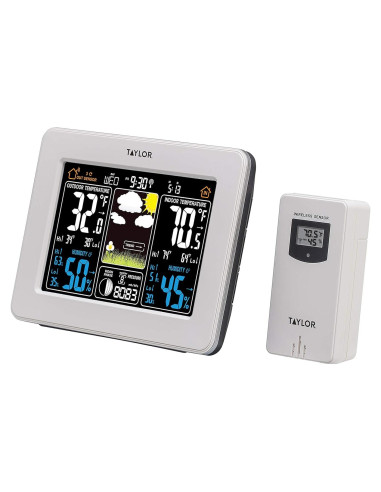 El pronosticador del tiempo deluxe de Taylor es una herramienta todo en uno que te proporciona todo lo que necesitas saber para prepararte con confianza para el día. El pronosticador muestra con precisión los rangos de temperatura interior de 32F a 122F (0C a 50C) y los rangos de temperatura exterior de -4F a 140F (-20C a 60C) utilizando baterías alcalinas o de -40F a 140F (-40C a 60C) utilizando baterías de litio. El pronosticador también mide la humedad y las lecturas de presión barométrica, además de alertas de hielo, fases lunares y características de calendario y reloj. La humedad y temperatura tanto interior como exterior cuentan con indicadores de tendencia, así como un recuerdo de min/max. Para rastrear los cambios en la presión barométrica, el pronosticador deluxe ofrece un gráfico histórico de lecturas de presión. La unidad base puede acomodar hasta 3 sensores remotos inalámbricos y cuenta con una pantalla retroiluminada colorida para una mejor legibilidad.