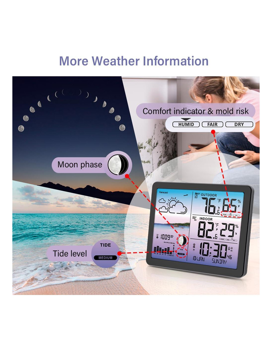 - Pantalla Colorida de 7.4": La Estación Meteorológica EM3566D cuenta con una pantalla HTN grande y vibrante, proporcionando una visualización clara de la información meteorológica desde múltiples ángulos. La retroiluminación se puede ajustar a 4 niveles según sea necesario, también se puede configurar para ajustar automáticamente su brillo con la luz. Para ahorrar energía, la pantalla solo permanece encendida cuando la estación meteorológica está conectada al adaptador de corriente.