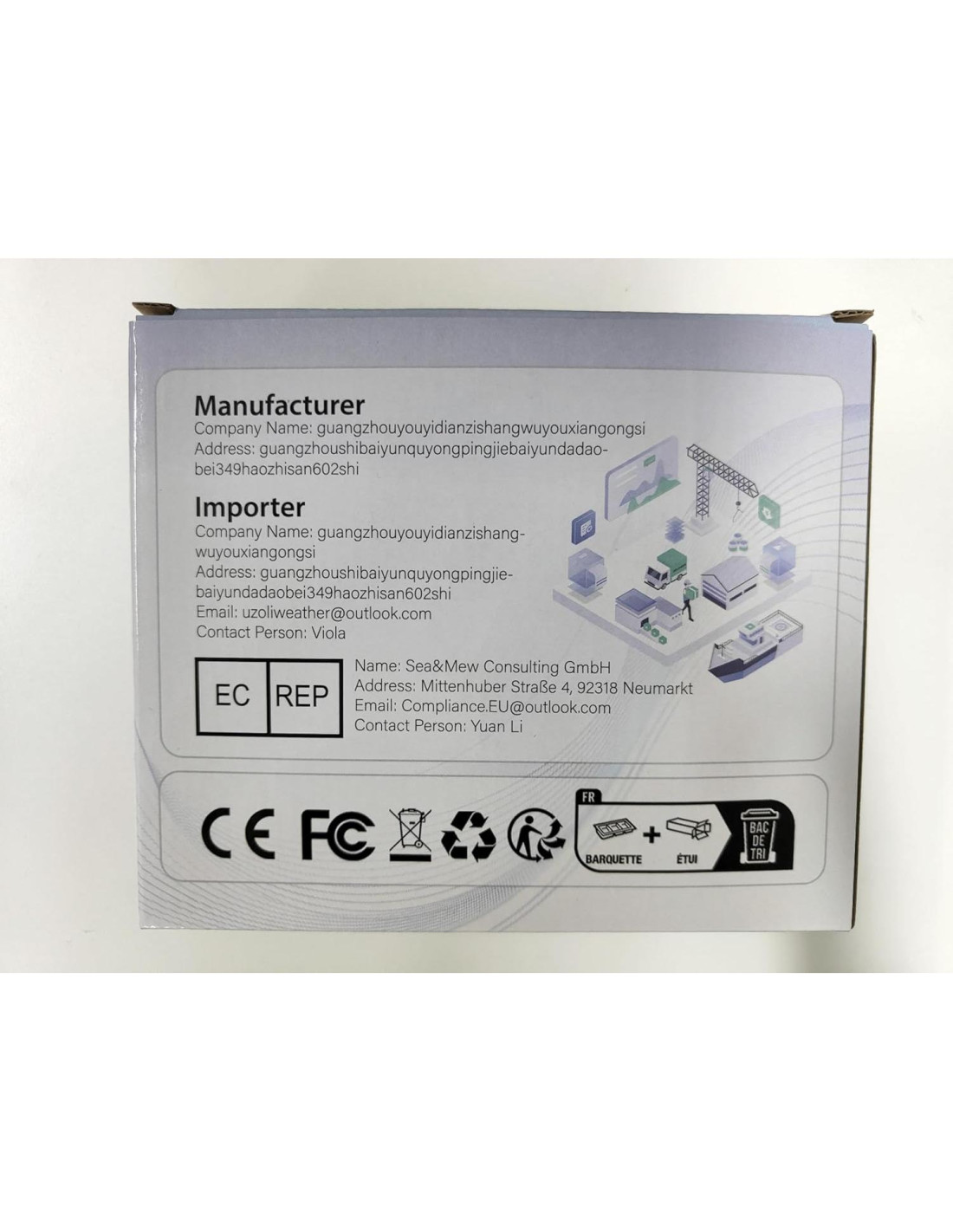 Uzoli es una marca que integra diseño, investigación, desarrollo, producción, ventas y servicio. proporcionamos a los clientes una experiencia de vida conveniente e inteligente. Nuestros productos incluyen estaciones meteorológicas, termómetros de piscina, pluviómetros y temporizadores de agua, que están diseñados para una vida más fácil, cómoda y eficiente. Nuestro objetivo es ser un proveedor líder de productos para el hogar inteligente y estilo de vida digital que mejoren la calidad de vida general de los clientes. Puedes establecer alertas para la temperatura/humedad interior y exterior, y personalizar los valores de límite superior/inferior para un monitoreo preciso, para mantener un ambiente saludable, cómodo y seguro. 3 opciones para el modo de repetición de alarma: (1) Lunes a Viernes (2) Sábado y Domingo (3) Lunes a Domingo Rango de configuración del tiempo de repetición: 5~60 minutos. Visualiza rápidamente los registros diarios de los valores mínimos/máximos de temperatura y humedad interior y exterior. Después de configurar correctamente la hora y la fecha, la pantalla de la estación meteorológica inalámbrica mostrará un patrón vívido de fases lunares desde la luna nueva hasta la luna llena según la fecha del calendario. Es una gran característica para las personas que están interesadas en o tienen el hábito de observar las fases lunares. El nivel de marea se divide en 3 niveles: alto, medio y bajo. Estación meteorológica interior: adaptador de corriente de CC (incluido) o 2 baterías AA (no incluidas) Sensores remotos: 2 baterías AA (no incluidas) Montaje en pared o soporte de mesa.