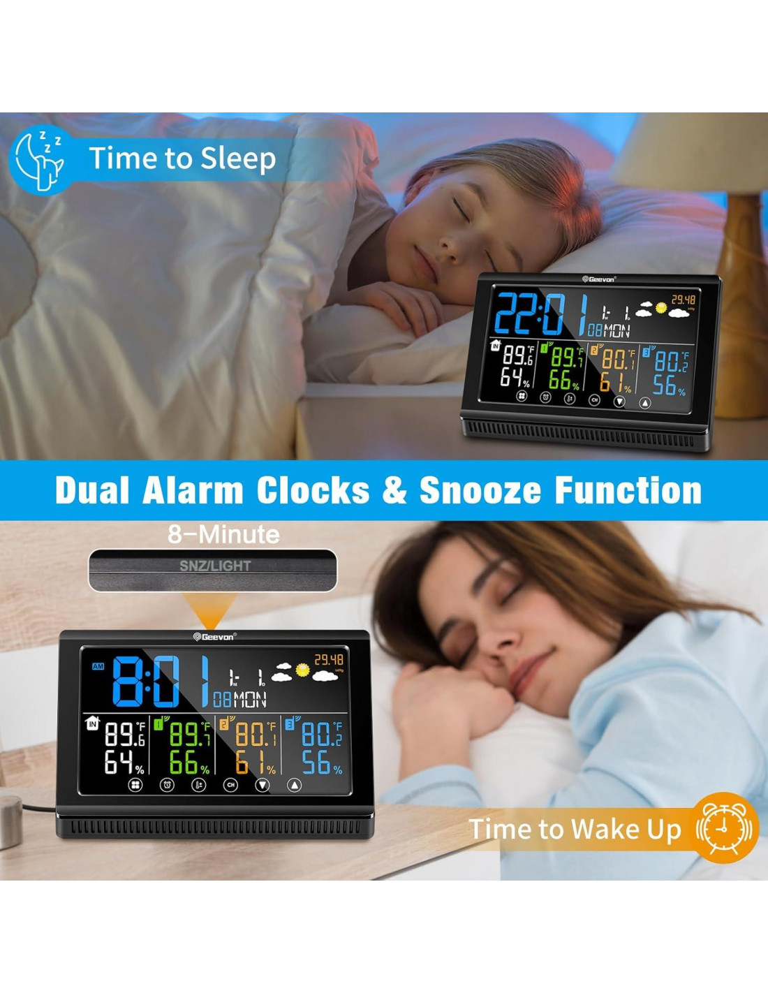 - Estación Meteorológica Multifuncional para el Hogar con Diseño Moderno Geevon estación meteorológica interior exterior tiene una función integral, como detección de temperatura y humedad interior y exterior, visualización de hora y fecha, configuración de alarmas duales, pronóstico del tiempo, presión barométrica, indicador de confort y registros de mínimo/máximo.
