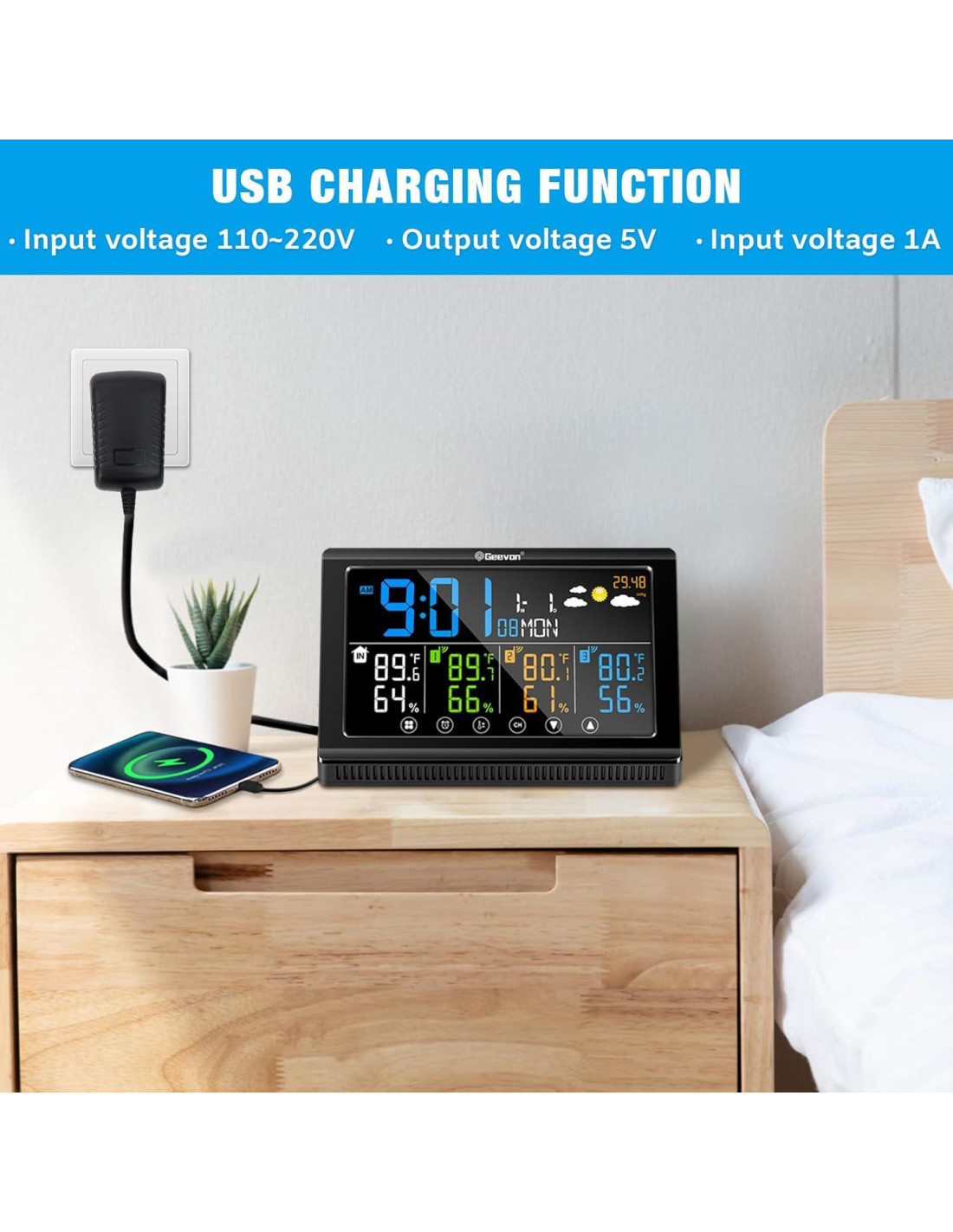 - Estación Meteorológica Inalámbrica con Pantalla HD a Color y Dígitos Vivos La estación de pronóstico del tiempo exterior Geevon adopta una gran pantalla LCD de 7.6''. Este diseño proporciona a los usuarios ángulos de visión amplios de 350. El puerto USB incluido puede ayudar a cargar tus teléfonos móviles, tabletas y otros dispositivos electrónicos.