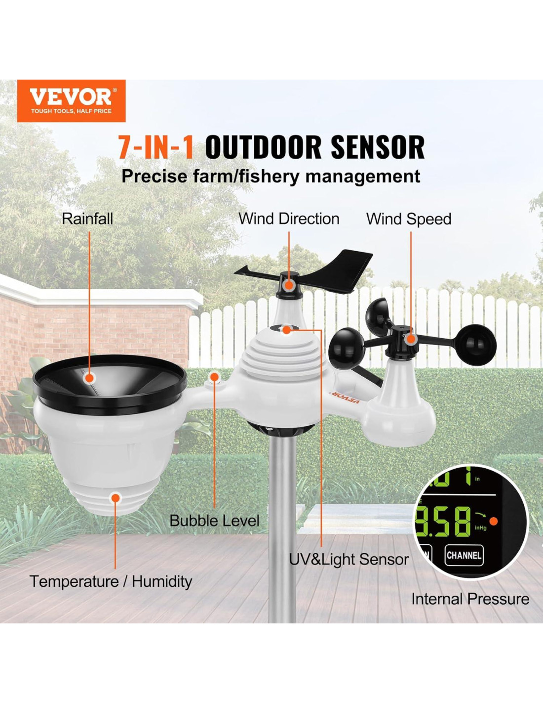 - Sensor 7-en-1: La estación meteorológica interior exterior monitorea con precisión la velocidad del viento, la dirección del viento, la temperatura, la humedad, la lluvia y la luz para que puedas controlar los cambios climáticos en casa. Nivel de impermeabilidad IPX6, incluso en lluvia intensa, también puede monitorear con precisión los datos.