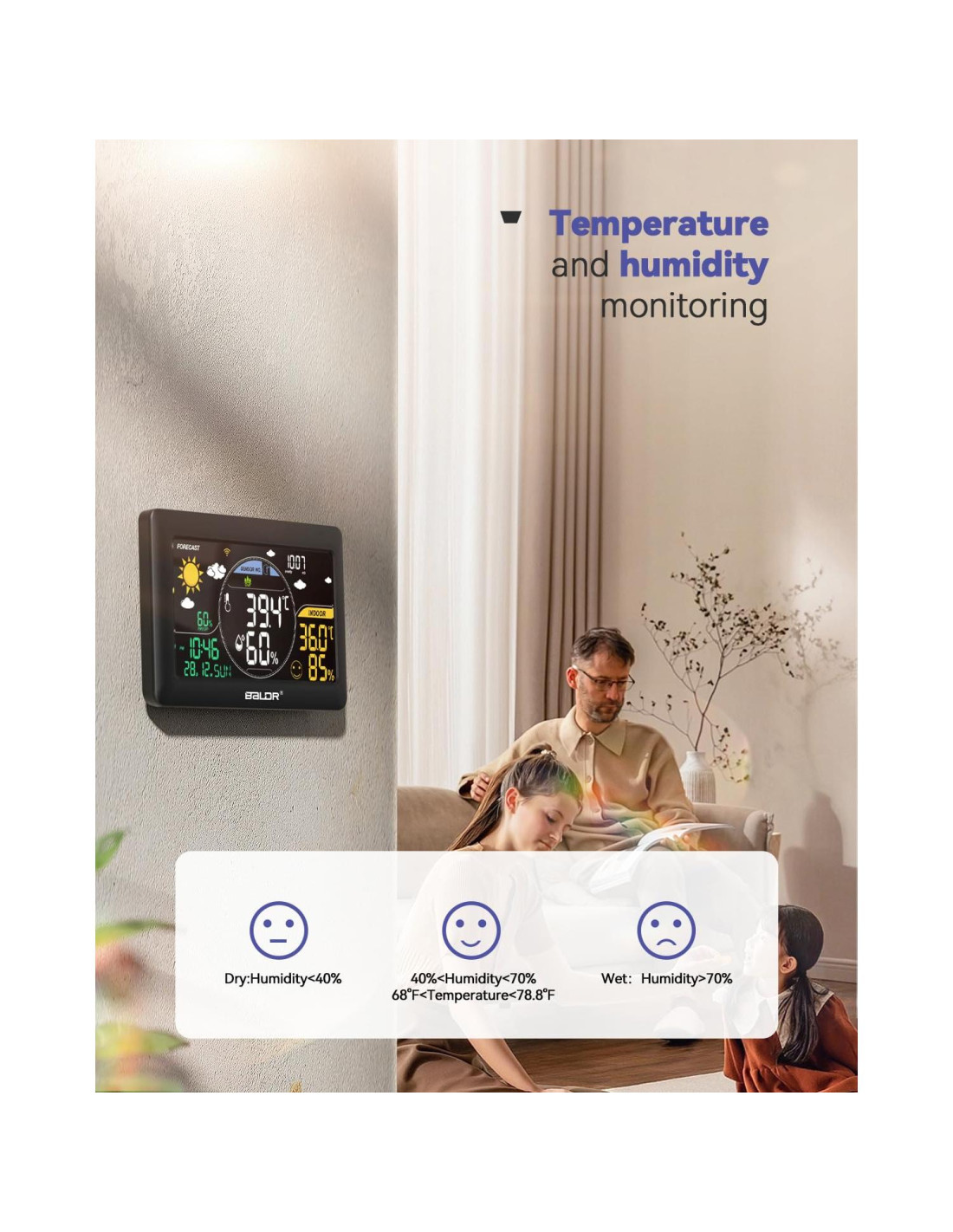 - [Multifuncional] Las estaciones meteorológicas proporcionan información detallada del pronóstico del tiempo (para las próximas 8-24 horas), incluyendo temperatura, humedad, (máxima/mínima, máxima/mínima) presión barométrica, hora/fecha, indicador de confort (evaluación combinada del confort interior basada en temperatura y humedad)