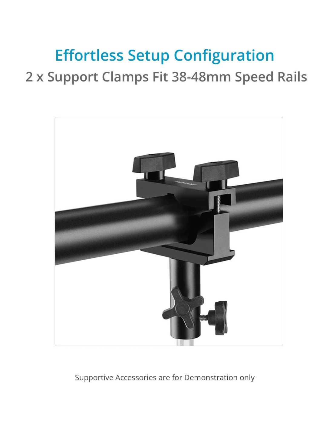 - Abrazaderas de Soporte Ajustables: Se adapta a rieles entre 38mm y 48mm, proporcionando máxima flexibilidad para diferentes configuraciones de rig