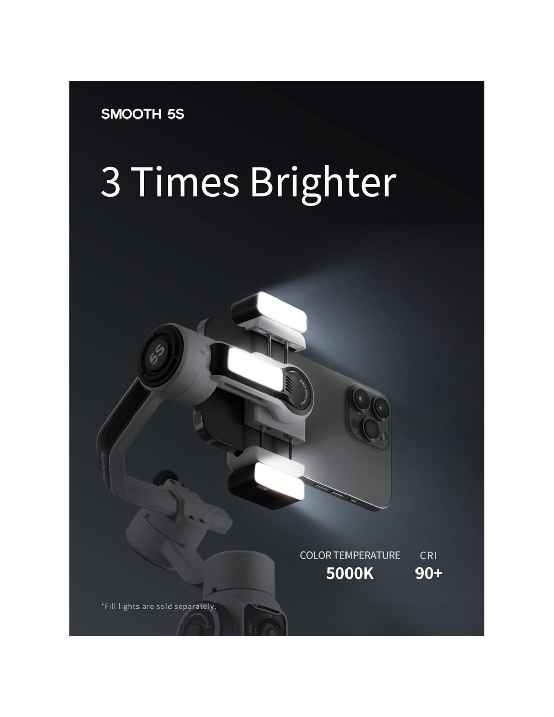 - Luces Magnéticas y Luz de Relleno Incorporada: Una nueva luz de relleno con una iluminancia máxima de 650 lux se ha añadido al eje de inclinación, haciendo que el SMOOTH 5S sea un todoterreno para contar mejor tu historia. Dos luces de relleno magnéticas más la incorporada te brindan un efecto de iluminación inigualable que permite una iluminancia máxima de 2040 lux.
