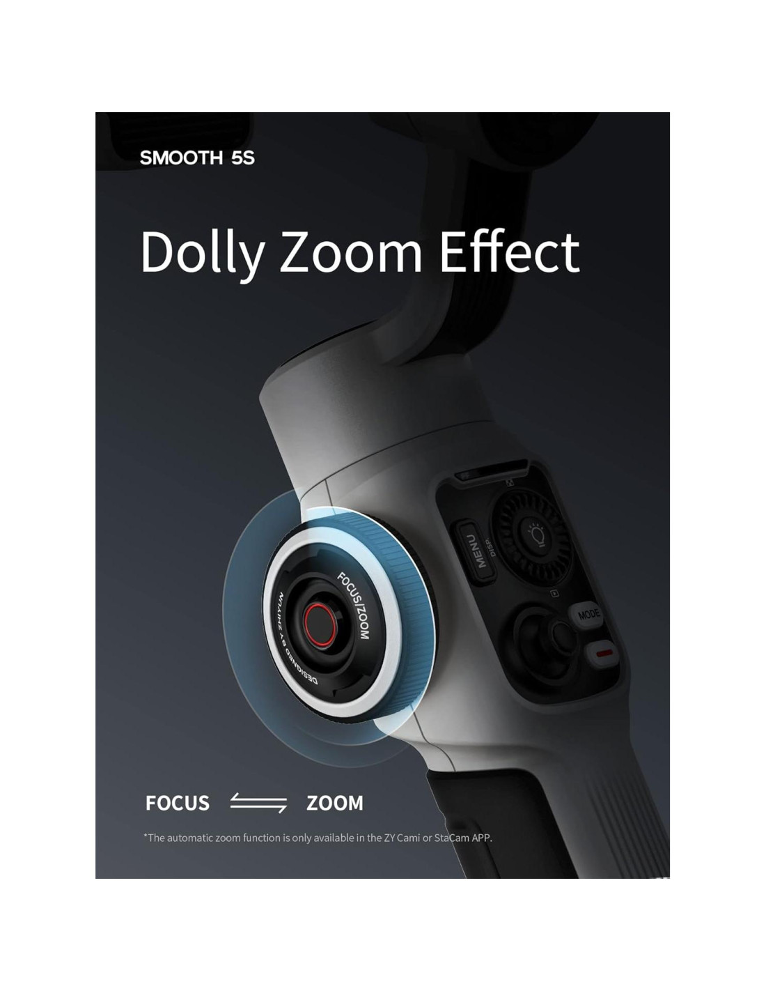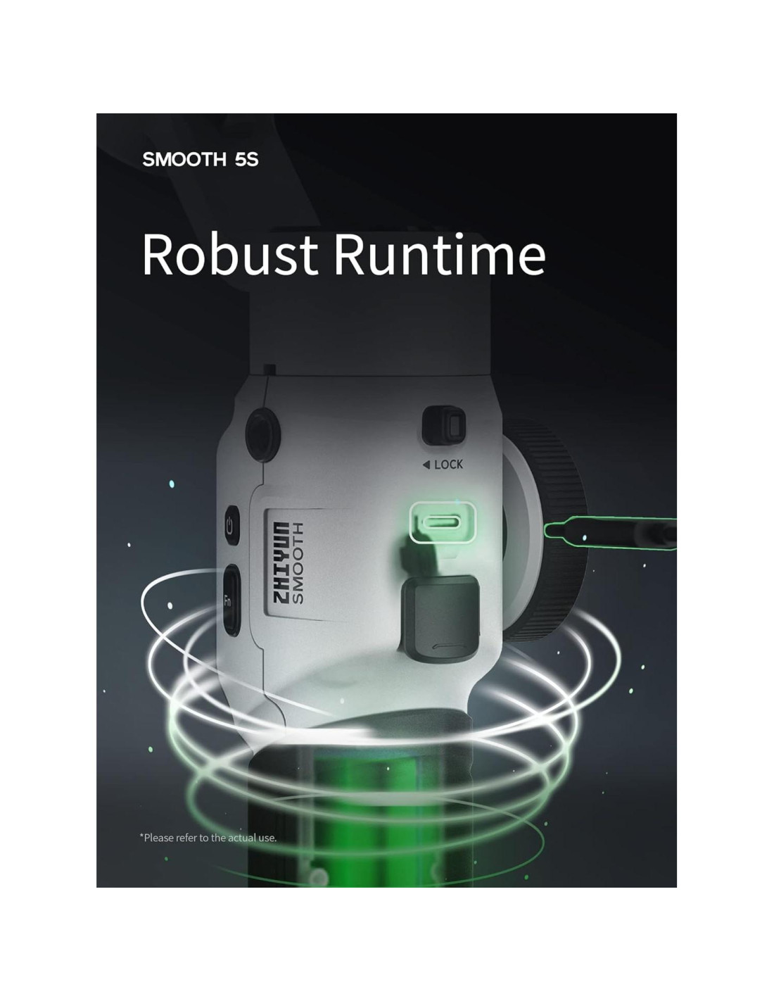 - Pro Diseño de 3 Ejes: El SMOOTH 5S se destaca con su estructura profesional de 3 ejes pivotantes ortogonales que te brindan más posibilidades con una mayor visión. El espacio más amplio entre cada eje facilita disparos en ángulos extremos, permitiéndote hacer tomas cinematográficas sin límites.