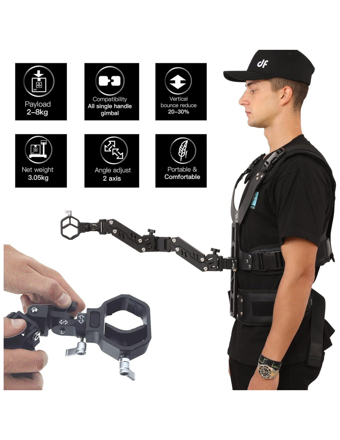 - Diseño Cómodo: Nuestro chaleco gimbal portátil reduce la presión en los brazos y extiende tu tiempo de grabación. El brazo de aleación de aluminio y los resortes resistentes reducen el movimiento hacia arriba y hacia abajo para un metraje suave y mantienen tu equipo seguro. Los cierres a presión en el pecho ayudan a ajustar la tensión del chaleco gimbal al pecho para cineastas de diferentes pesos.
