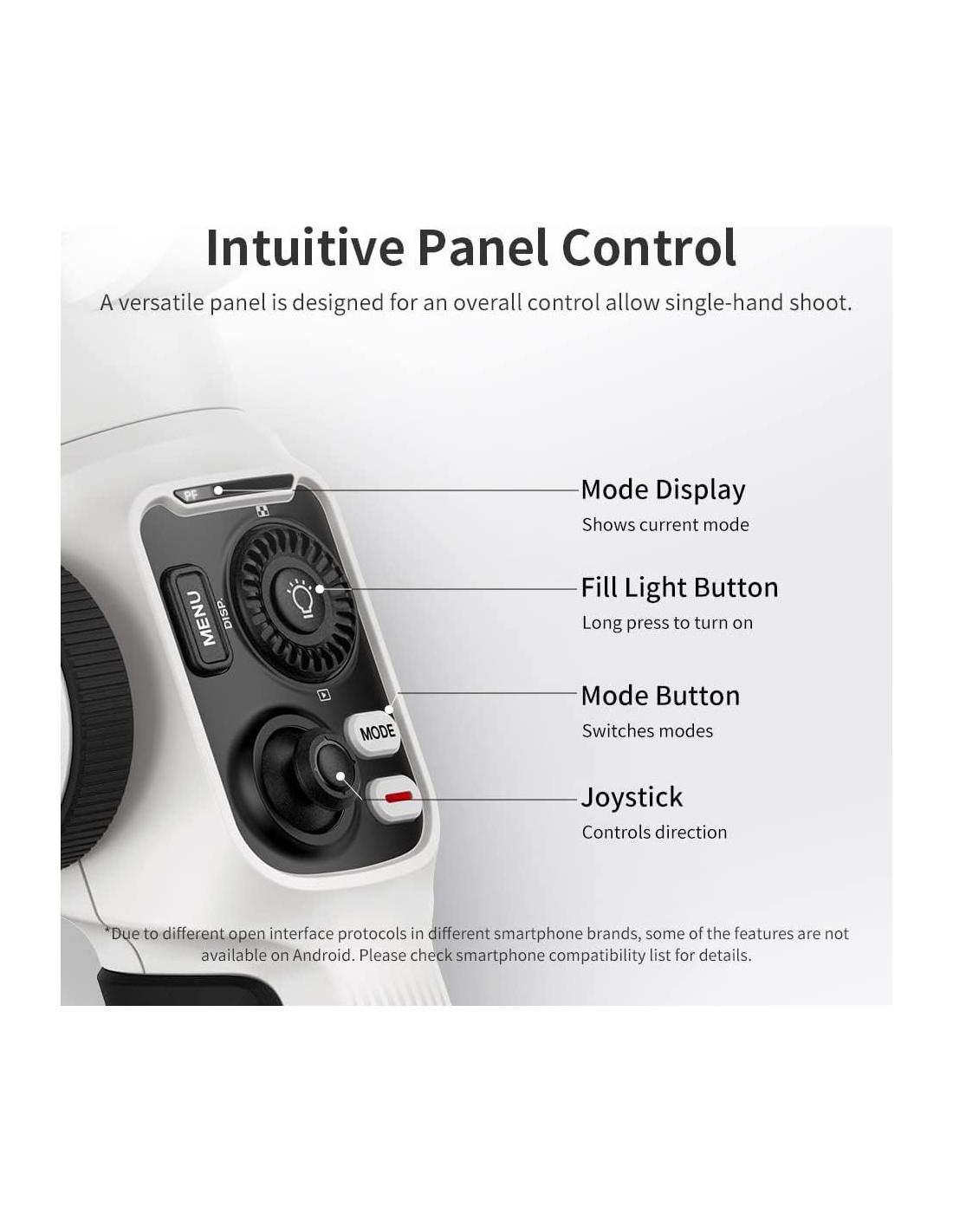 - Nueva Versión de smooth 5 [Luz de Relleno Incorporada y Amplia Compatibilidad] Se ha añadido una nueva luz de relleno con una iluminancia máxima de 650 lux al eje de inclinación, haciendo que SMOOTH 5S sea un todoterreno para contar mejor tu historia. Los motores de acero magnético con algoritmos mejorados alimentan firmemente teléfonos de gran tamaño. La abrazadera de teléfono más ancha admite opciones de lentes externas para tu creación de siguiente nivel.