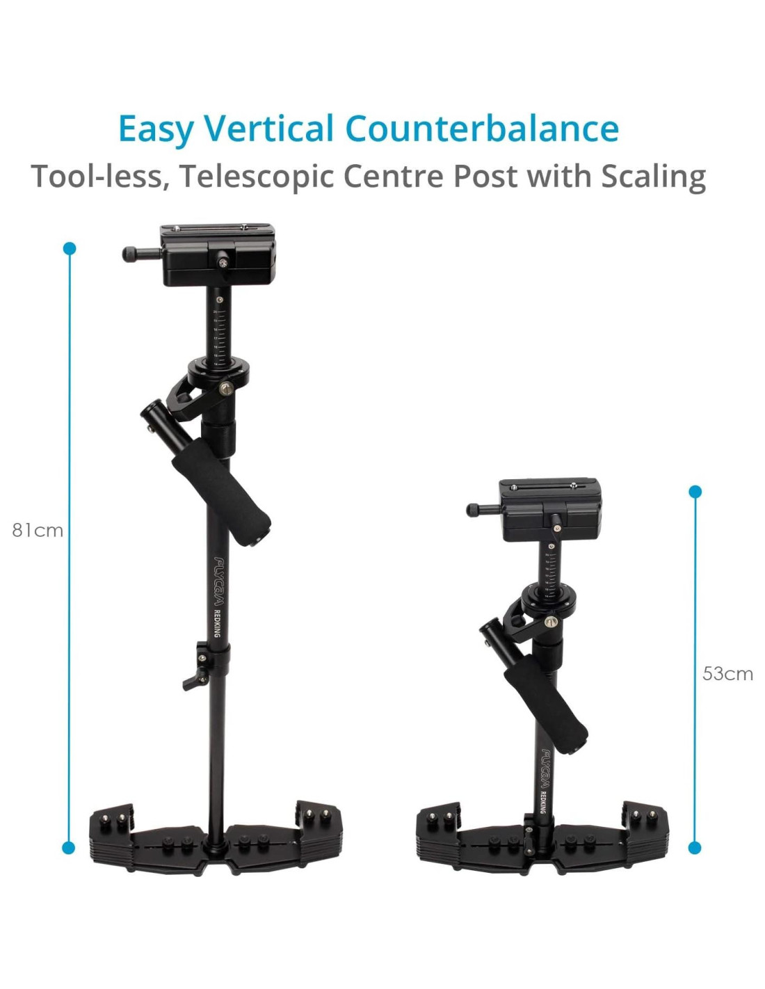 Plataforma de Cámara con Liberación Rápida de Cola de Milano permite un montaje/desmontaje rápido de la cámara. Perillas de ajuste fino en la plataforma de la cámara para ajustes de cámara de adelante hacia atrás y de lado a lado. Poste central telescópico con marcas de escala grabadas con láser que ofrecen ajustes rápidos y precisos. Cardán de 3 ejes ajustable en posición con rodamientos de bolas que ofrecen un funcionamiento suave. Bloqueo de giro positivo permite una operación fácil y segura en modo bajo. Mango acolchado de espuma ofrece una operación cómoda. Plataforma base ajustable con discos de peso para lograr un equilibrio dinámico perfecto.