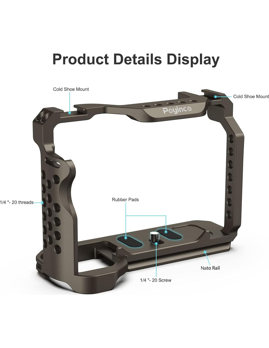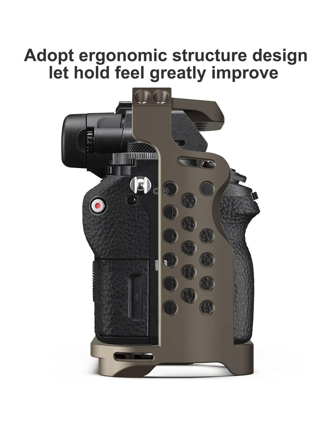 - [APLICABILIDAD] La jaula es compatible con Sony Alpha 7SIII / A7SIII / A7S3. La cámara se asegura en la jaula con 1 tornillo en la parte inferior, 2 almohadillas de goma evitan rayones o daños a la cámara. Permite disparar en múltiples ángulos y se puede sostener fácilmente.