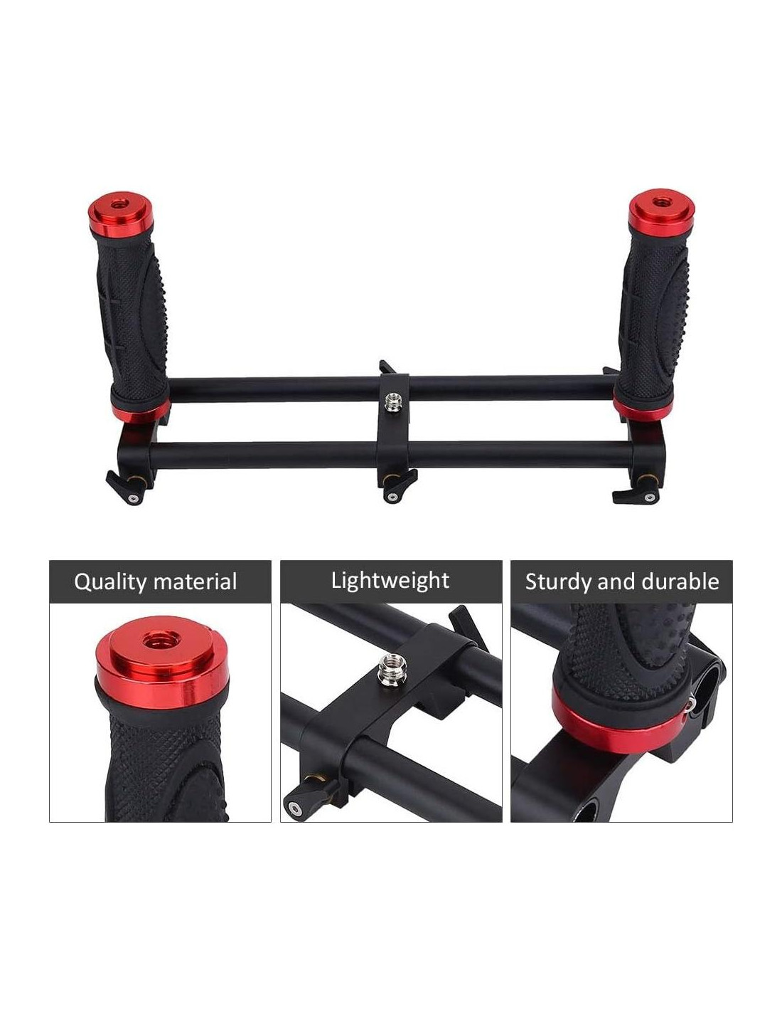 Descripción: Este estabilizador de mano es especial por su diseño de doble mango, lo que facilita a las personas disparar con una fijación estable y firme. Hecho de buen material con un buen mecanizado, resistente y ligero, es una herramienta práctica y útil para fotógrafos. Características: 1. Hecho de material de calidad, ligero, resistente y . 2. El diseño de doble mango es antideslizante y cómodo, lo que hace que sostener un estabilizador sea más fácil y estable. 3. El soporte tiene agujeros para tornillos de 1/4'' y un tornillo de 3/8'', compatible con la mayoría de estabilizadores y cámaras. 4. El soporte de liberación rápida se puede mover a lo largo de las varillas y se puede bloquear fácilmente con la perilla de palanca, lo que ofrece posibilidades para el ajuste de posición. 5. Portátil y práctico, accesorio útil para amantes de la fotografía. Especificación: Material: Aleación de aluminio Color: Negro Agujero para tornillo: 1/4'' Tornillo: 3/8'' Tamaño: Aproximadamente 30.5 x 10 x 16.5 cm (12 x 3.9 x 6.5 pulgadas) Peso: Aproximadamente 500 g Adecuado para , Feiyu, MOZA, Beholder Lista de Paquete: 1 * Gimbal de Doble Mango