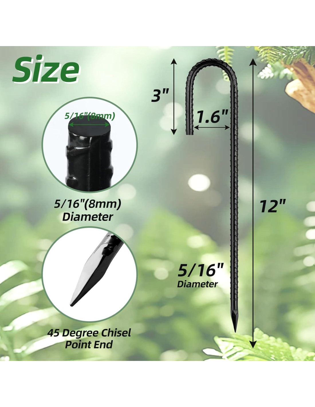 - [ESTACAS DE REBAR DE 12 PULGADAS] Vendidas en paquetes de 16 piezas. Longitud de 12 pulgadas (30,48 cm) desde la punta hasta el gancho, estacas j de 5/16 pulgadas (8 mm) de diámetro. El gancho mide 3" (7,62 cm) y el espaciado es de 1.6" (4,06 cm), perfecto para cercas de cadena, sosteniendo decoraciones al aire libre, invernaderos, carpas, gazebos y gigantes inflables, etc.