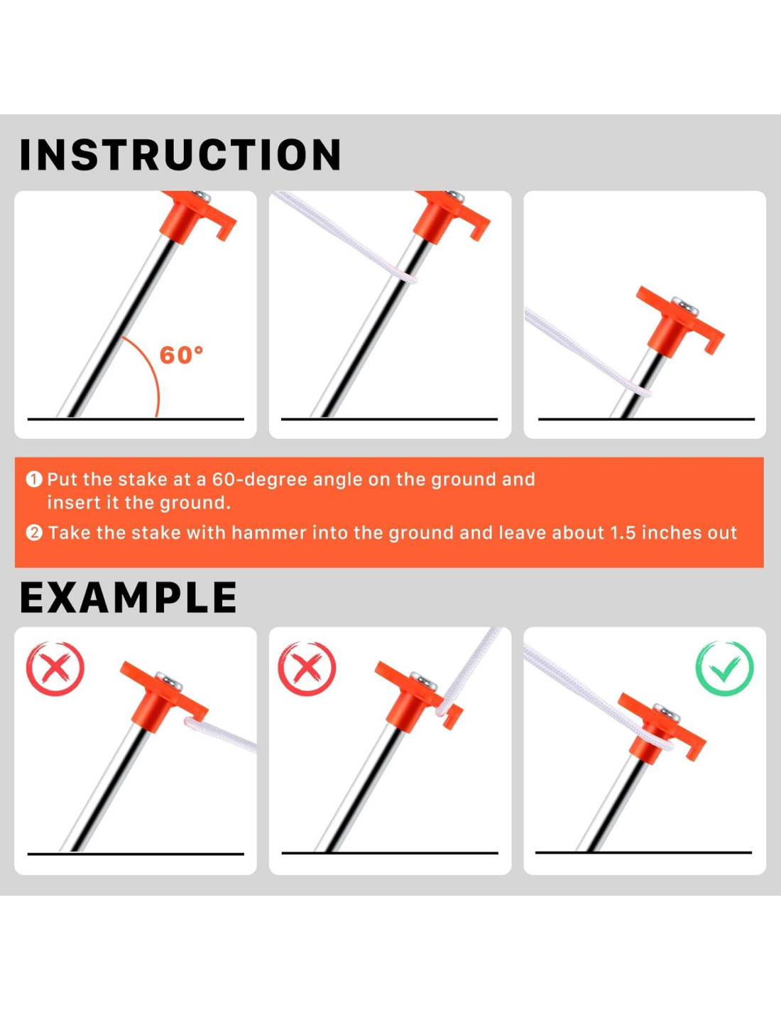 - Fácil de usar: Los puntos fresados son muy afilados y pueden penetrar fácilmente en suelos duros. Las estacas para tienda tienen cabezas más grandes para el uso de mazo. Coloca la estaca en el suelo en un ángulo de 60 grados y clávalo en el suelo, dejando aproximadamente 1.6 pulgadas (4 cm) para permitir suficiente espacio para tensar la cuerda