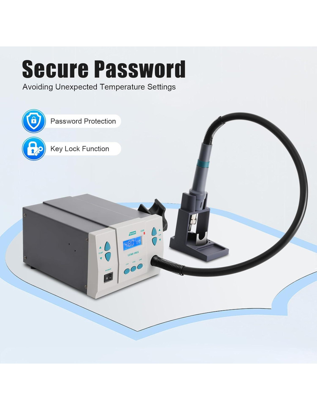 - [Ajuste Flexible] Su volumen de aire (1-120 niveles) y temperatura (212-932F) se pueden ajustar fácilmente para satisfacer diferentes necesidades de trabajo. Además, viene con 3 canales de trabajo CH1, CH2 y CH3, que se pueden personalizar para establecer el volumen de aire y la temperatura, guardando sus configuraciones utilizadas regularmente y saltando entre canales con solo presionar un botón.