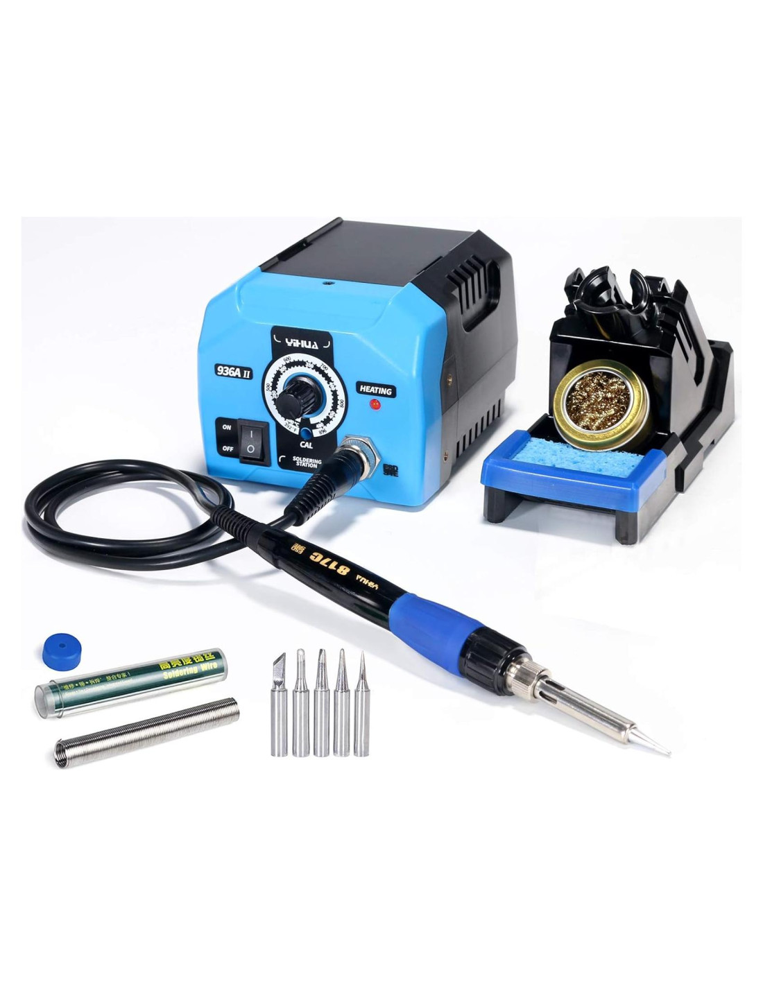 - Componentes incluidos: 1 x Estación de Soldadura 936A II, 1 x Soporte para Hierro de Soldar, 5 x Puntas de Soldadura (Punta Variada de Calidad), 1 x Paquete de Soldadura (1.0mm 15g), 1 x Hierro de Soldar 817C, 1 x Cable de Alimentación