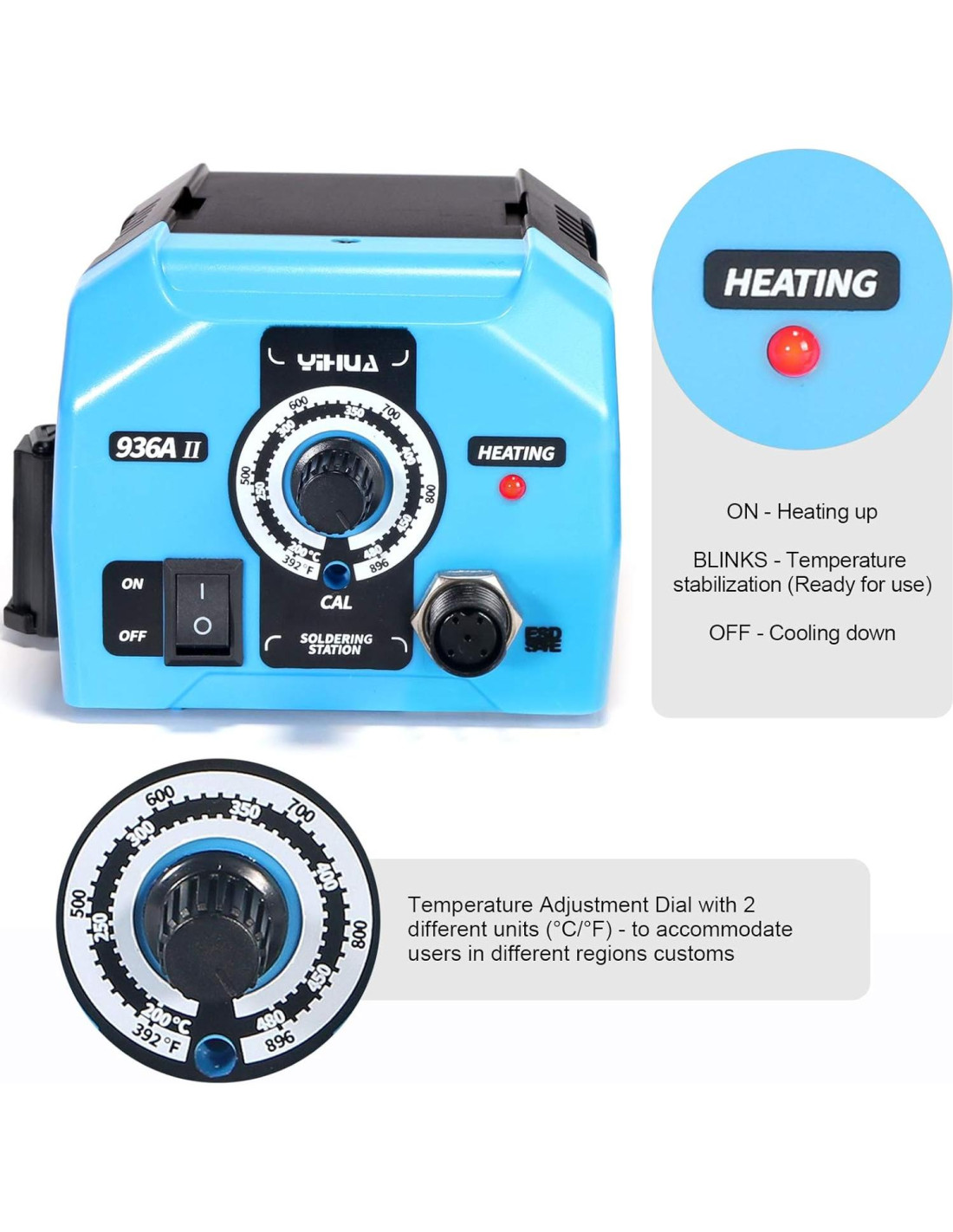 - Clasificación - La estación de soldadura 936A II puede ayudarte a completar aplicaciones de soldadura y desoldadura en componentes SMT y de orificio pasante como SOP, DIP, SOIC, y más.