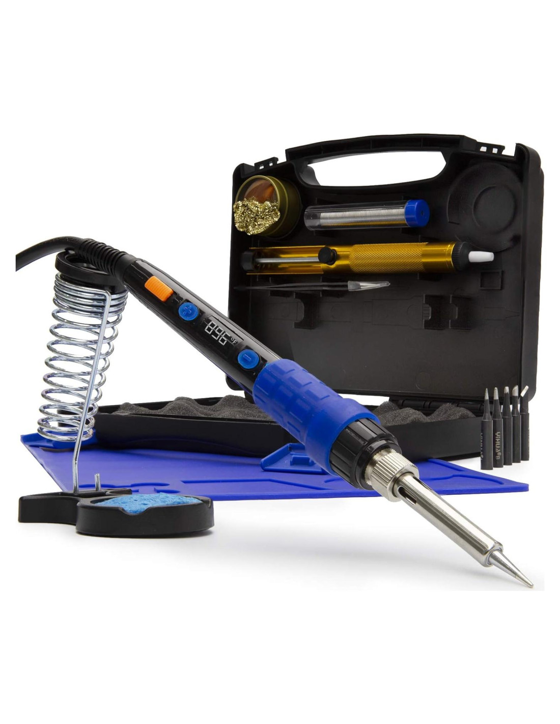 - Este kit de soldador incluye: soldador digital YIHUA 928D, alfombrilla de soldadura resistente al calor de 8.2' x 13' pulgadas (20,83 cm x 33,02 cm), alambre de soldadura, 5 puntas de soldador variadas, bomba de desoldadura, pinzas seguras para ESD, limpiador de puntas, esponja de limpieza y soporte para soldador (con adhesivo de base) todo empaquetado en un estuche duro portátil.