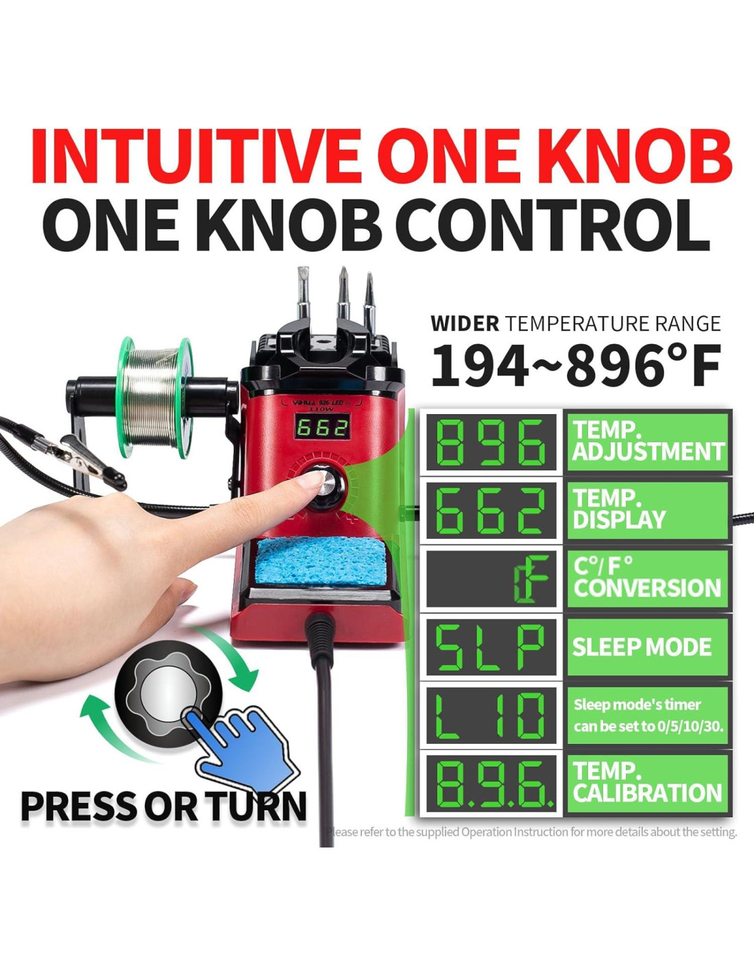 - Diseño Compacto con Funciones Versátiles - Todas las funciones básicas están integradas en la unidad compacta: panel de control de temperatura en la parte frontal, soporte para el hierro en la parte superior, esponja de limpieza en la parte inferior, soporte para alambre de soldadura montado en el lateral y ranuras para almacenamiento temporal de puntas. Este diseño integrado ahorra espacio en su banco de trabajo y se ve maravillosamente ordenado. Además, el soporte para el hierro en la parte superior está construido de manera estable y es difícil de volcar.