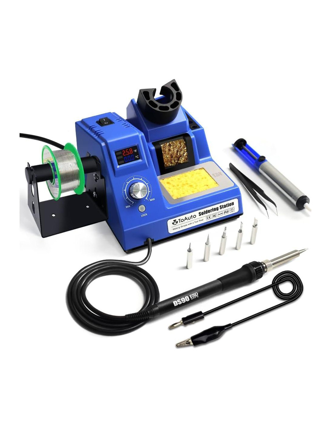 - [LUJOSO KIT DE SOLDADURA 13-en-1] Estación de Soldadura TOAUTO DS90 Watt mejorada con 5 x Puntas de Soldadura Adicionales, 1x Soporte para Soldar al Lado, 1x Rollo de Alambre de Soldadura Sin Plomo (30g), 1x Aspirador de Soldadura, 1x Pinzas Antiestáticas, 1x Limpiador de Punta de Latón, 1x Esponja de Limpieza, 1x Manual de Instrucciones. TOAUTO proporcionará una garantía de 1 año después de la venta y soporte técnico de por vida, y una devolución de 30 días.